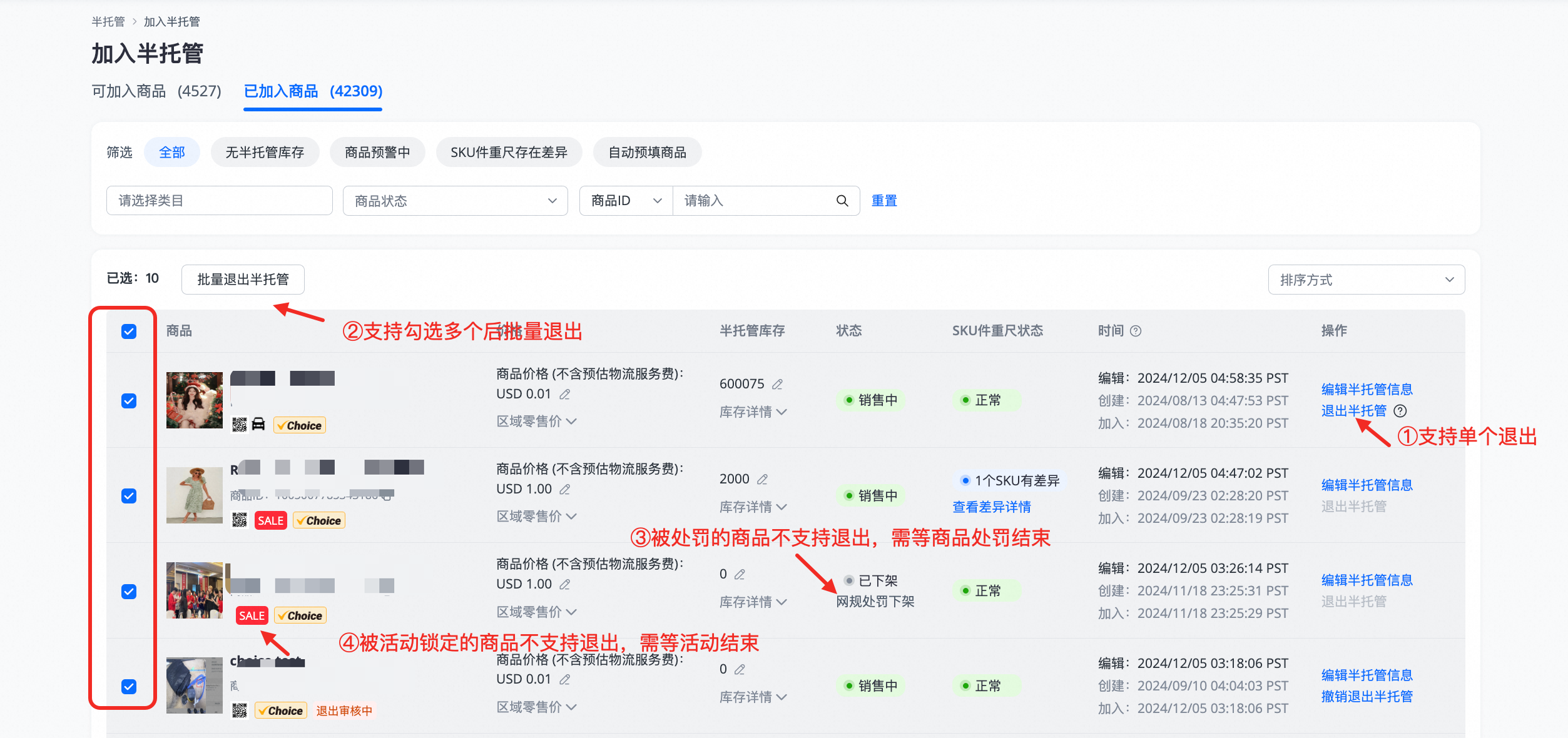 批量勾选20个商品后,可点击【批量退出半托管】,即可快速操作退出,提交后会返回批量退出结果页,如下图所示,您可以查看到具体的失败商品明细及对应原因: