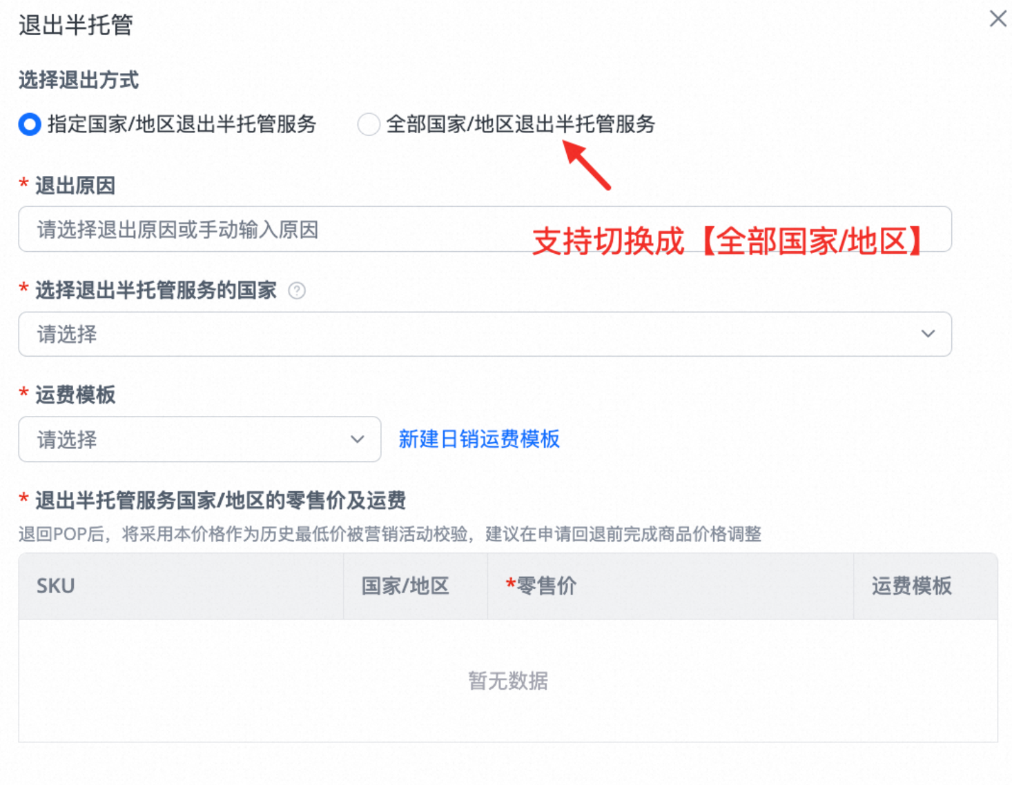退出申请发起前,需按照下述要求进行对应国家的运费模板设置,同时需确保退出后自运营的商品零售价不高于半托管的售价,以保证商品销量不受影响。