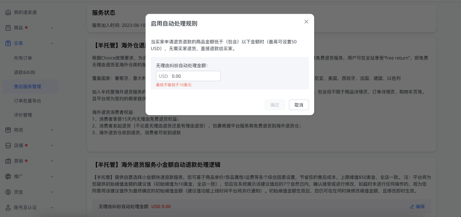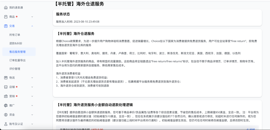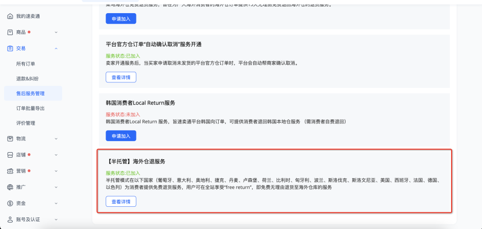 路径:【交易】-【售后服务管理】-【半托管海外仓免费退货服务】