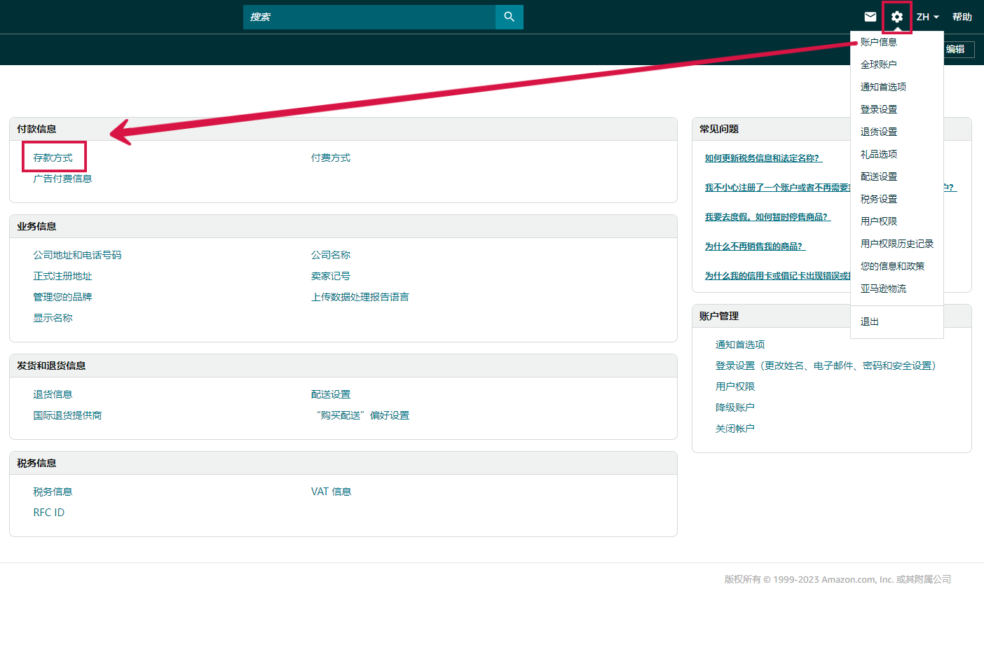登录Amazon美国站点后台,点击右上角菜单栏【设置】 → 【账户信息】,跳转页面后点击中间付款信息板块中的【存款方式】
