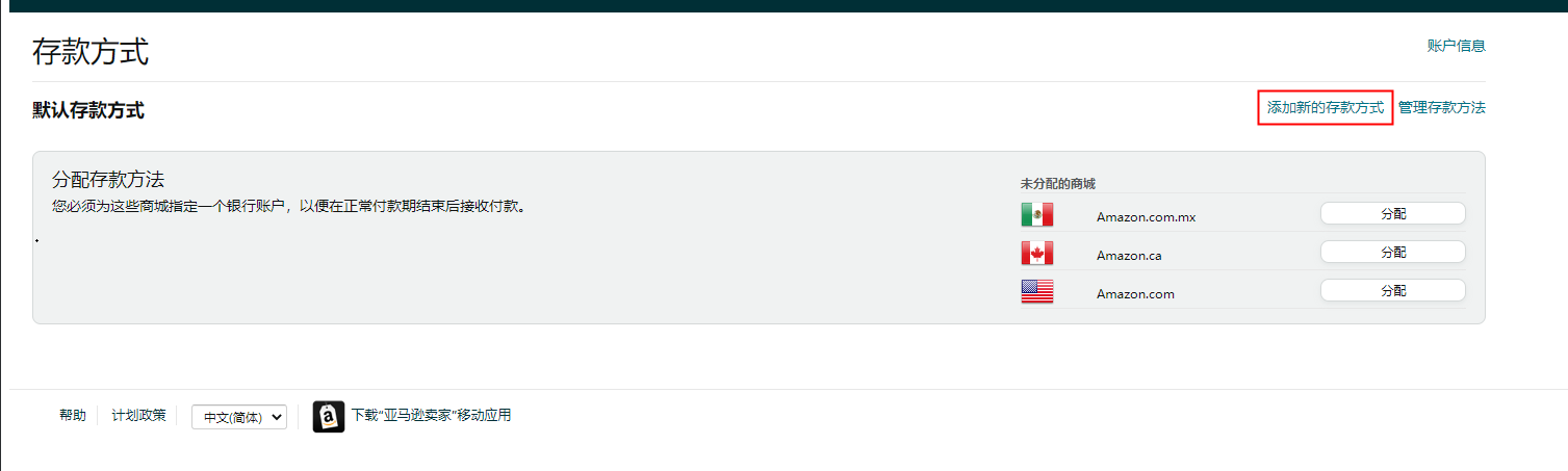选择您要添加银行存款方式的站点,美国站点请选择【Amazon.com】,点击【添加】