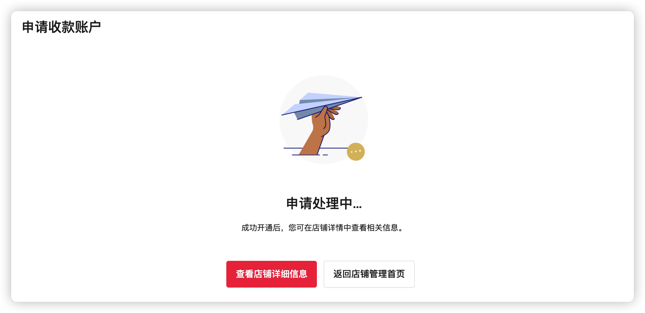 - 如果暂不授权,点击【申请】,系统显示【申请处理中】,通常最快1分钟即可生成收款账号