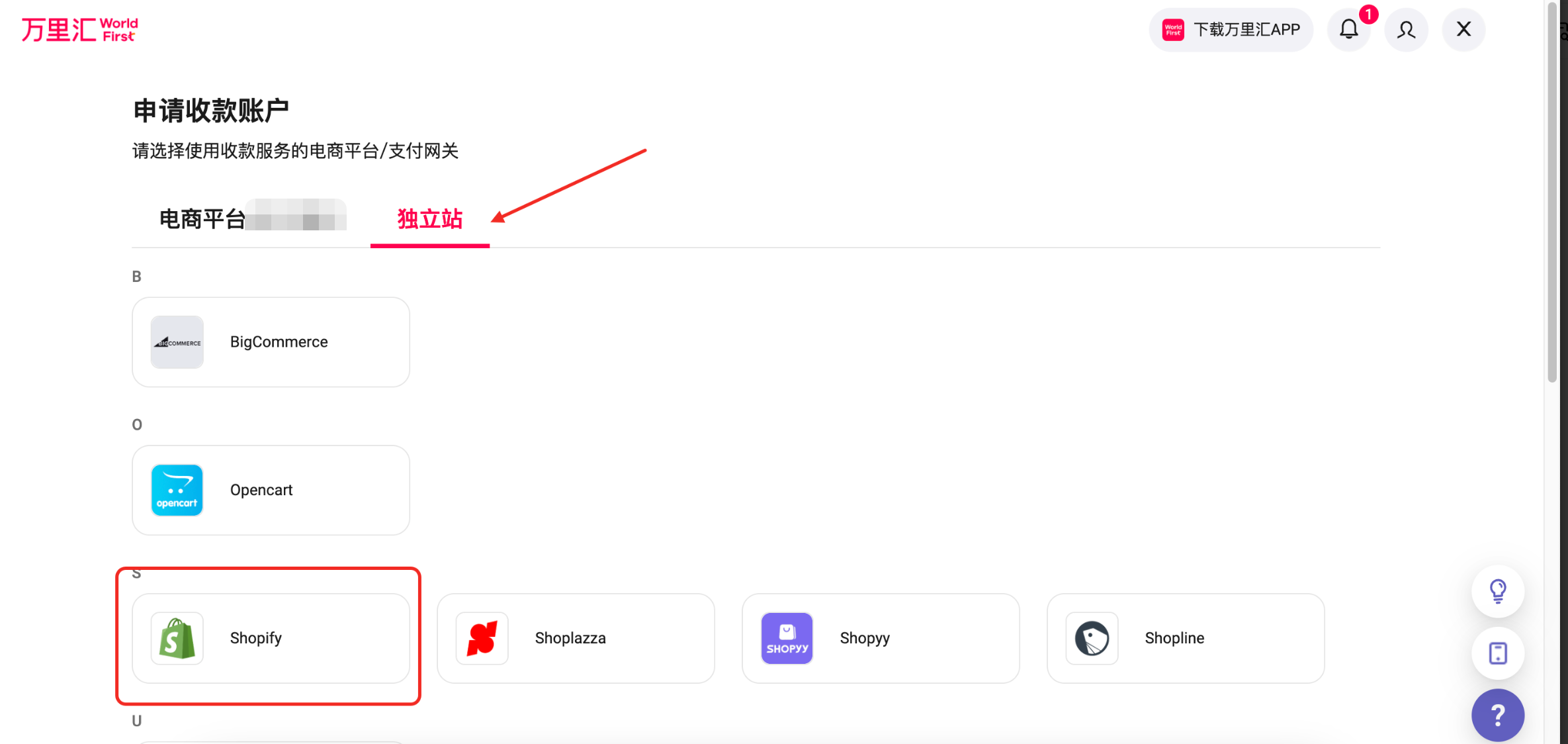 点击【独立站】-选择您店铺所在的建站平台按钮,以Shopify为例