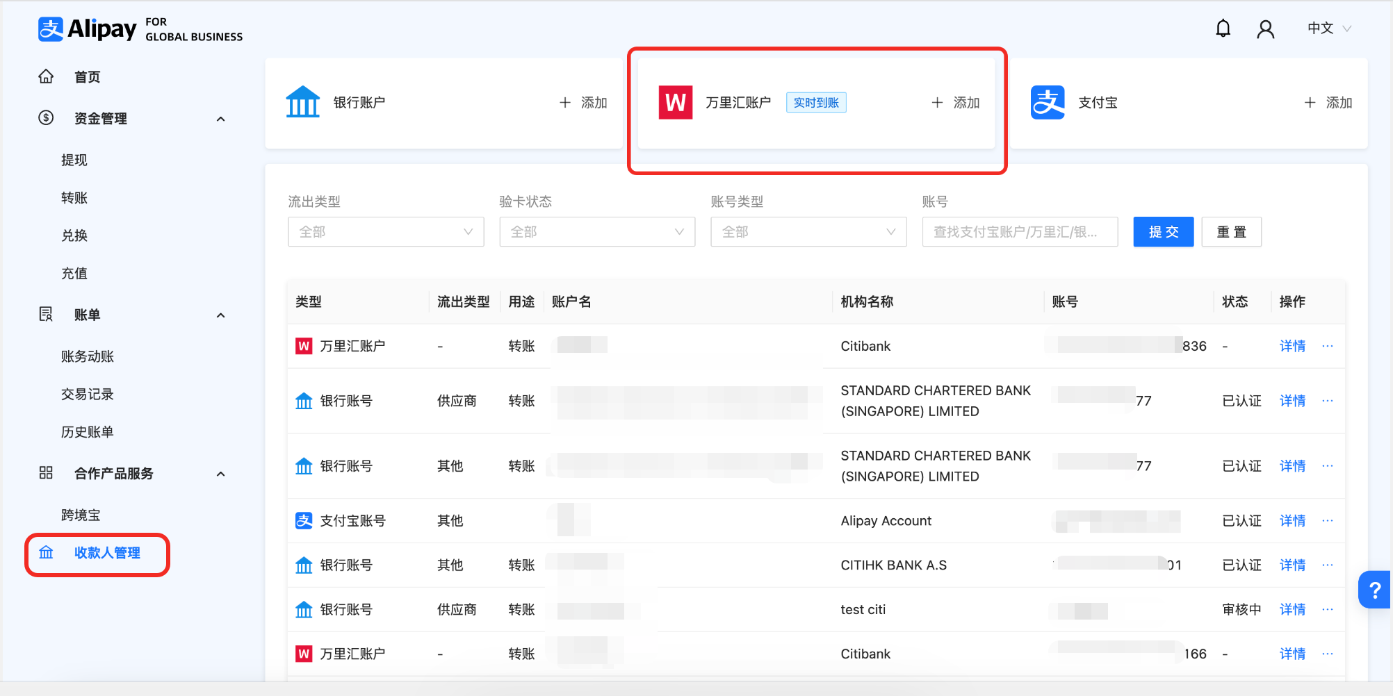 - 在【增加万里汇收款账户】页,请根据万里汇收款账户详情信息进行填写