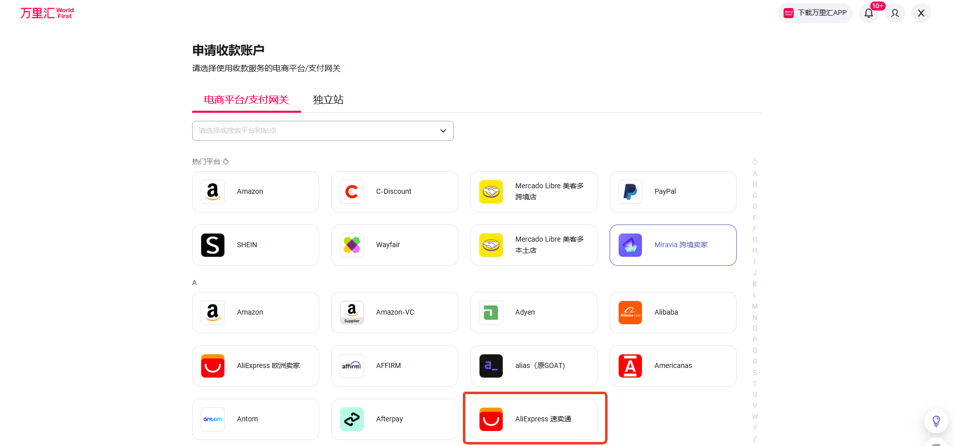 - 在【申请电商收款账户】页面中,选择【Aliexpress】店铺 →【申请】