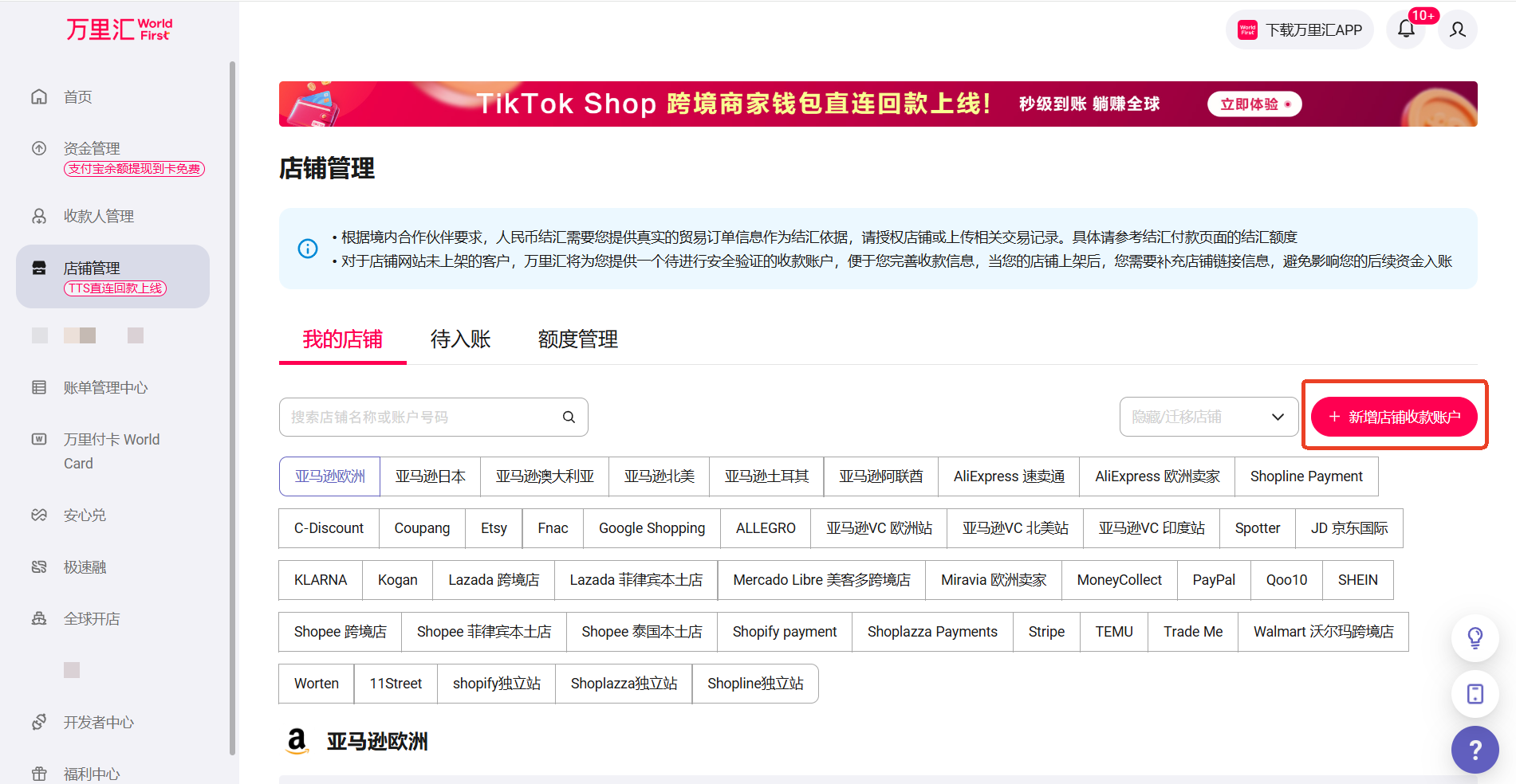点击【店铺管理】选择右侧【新增店铺收款账户】
