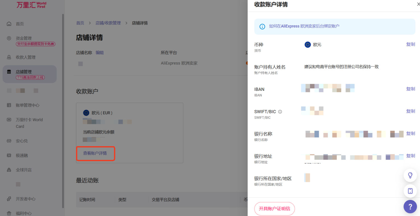 针对已新增好的店铺收款账户点击【详情】进入店铺详情页面,选择【查看账户详情】查看右侧收款账户详情。