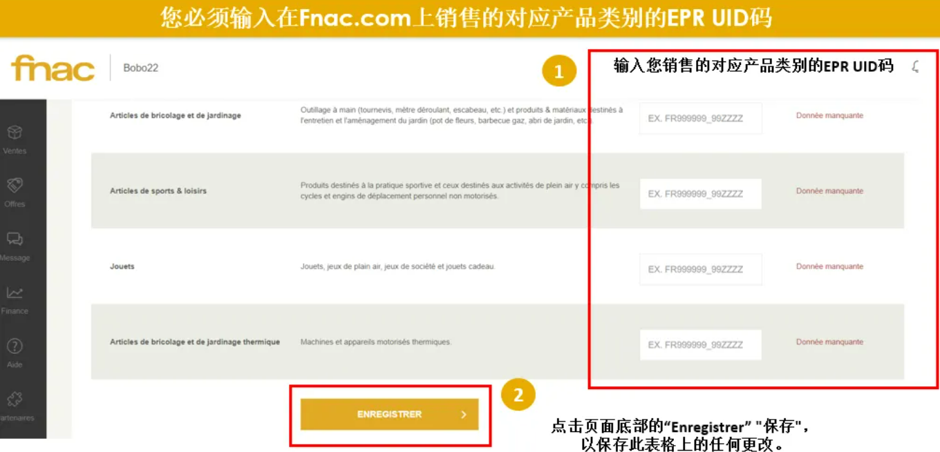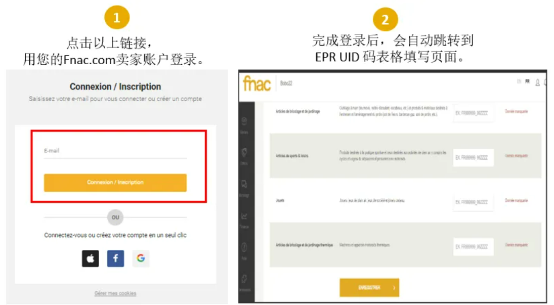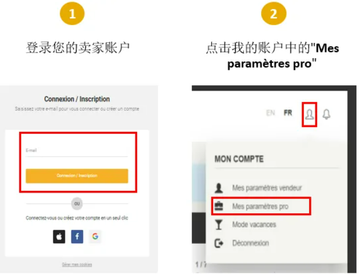 选择1 : 通过以下链接,用您的Fnac.com卖家账户登录。https://mp.fnac.com/compte/vendeur/boutique/configuration/rep