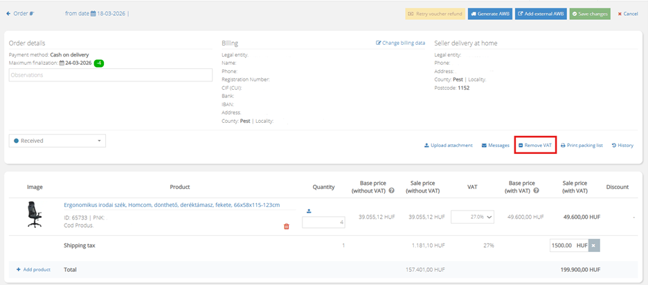 如果您在总部所在地以外的平台上销售产品(例如,您是匈牙利卖家,但在罗马尼亚平台上销售产品),并且客户是法人实体,而您的公司拥有欧盟内部增值税,则发票上无需包含增值税,并且必须将金额退还给客户。