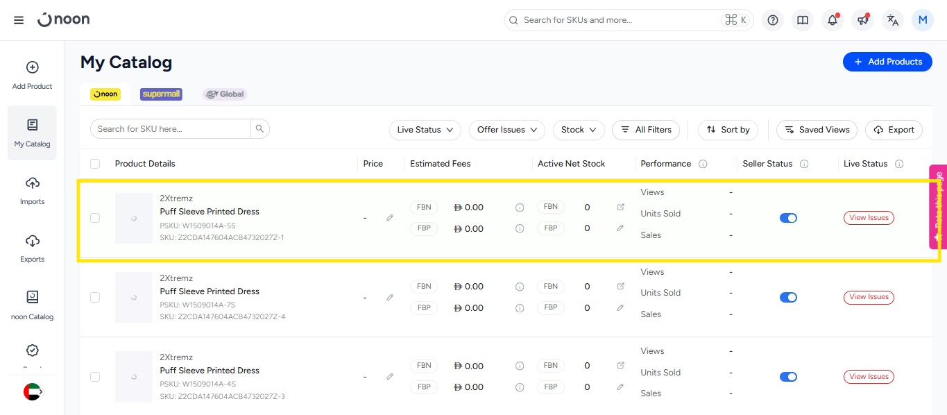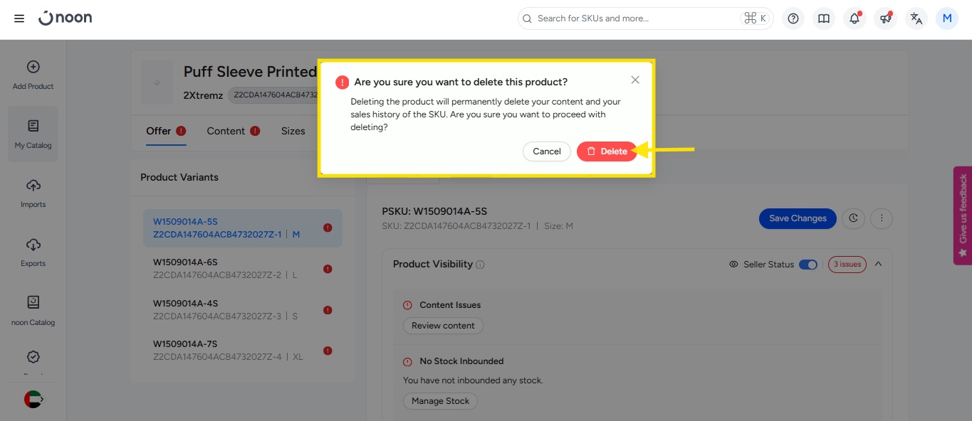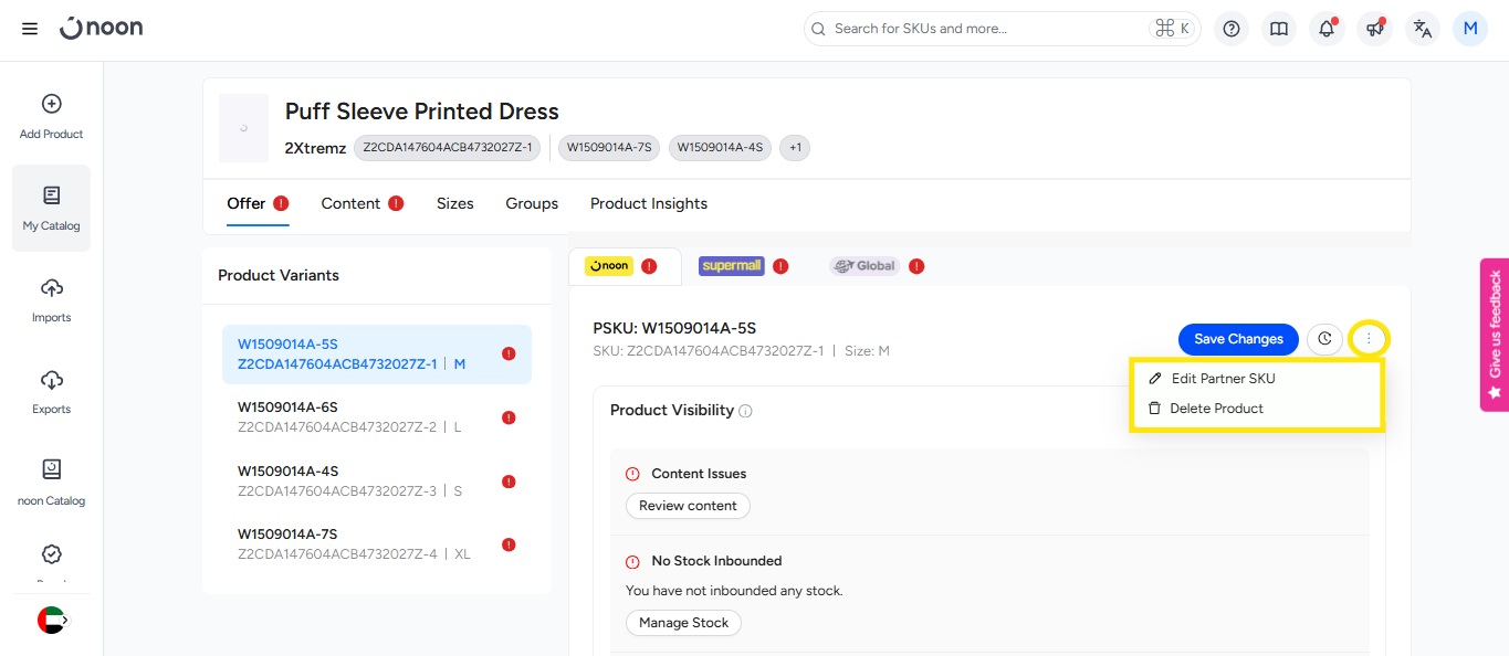 - 在内容页面上,点击操作按钮。在下拉菜单中,您会看到删除 SKU 的选项。点击它。
