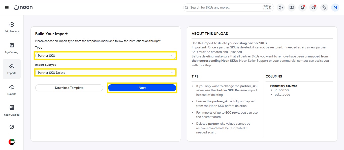 -选择导入类型为“合作伙伴 SKU”,导入子类型为“删除合作伙伴 SKU”,然后点击“下载模板”。在下载的模板中,填写您要删除的 PSKU 代码。