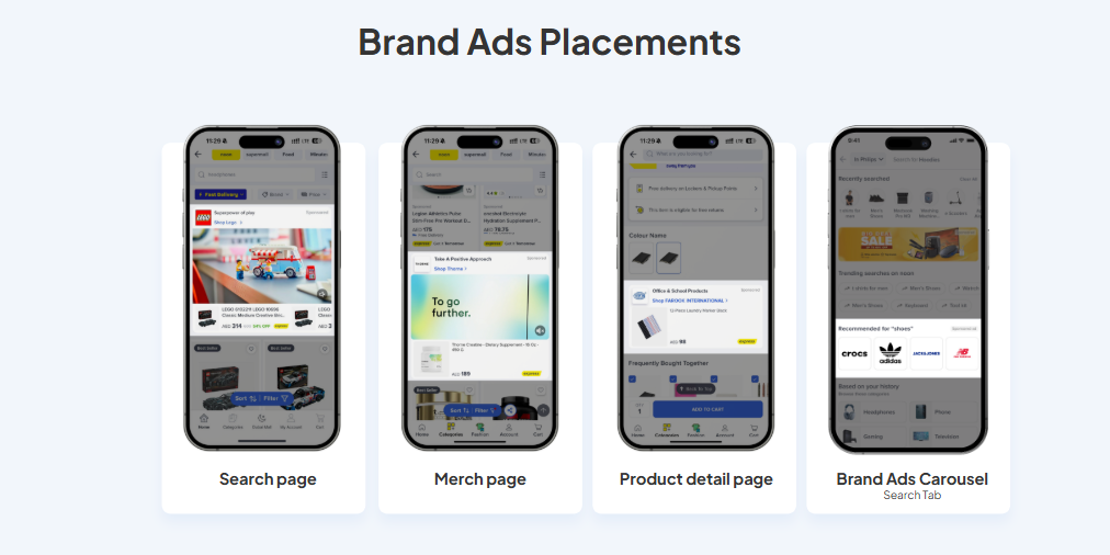 品牌广告旨在通过在关键位置展示品牌标志、自定义标题和多款产品(见下图),提升品牌知名度和品牌曝光度。这些广告提供横幅和视频两种格式,帮助品牌吸引顾客注意力并提高互动率。