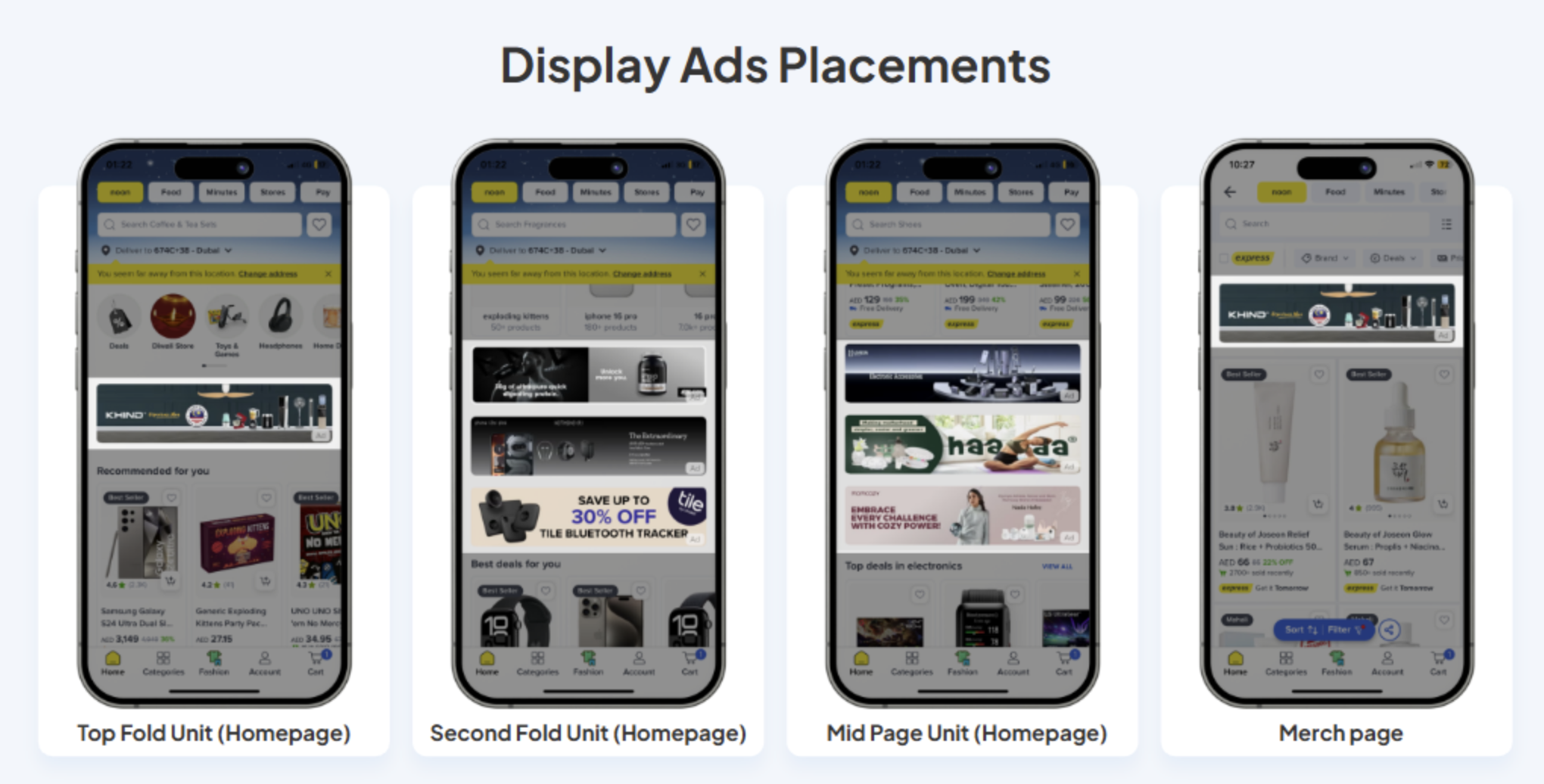 noon ads 提供三种自助式广告解决方案——产品广告、品牌广告和展示广告——每种解决方案都有其独特的目标,以满足不同的广告需求。