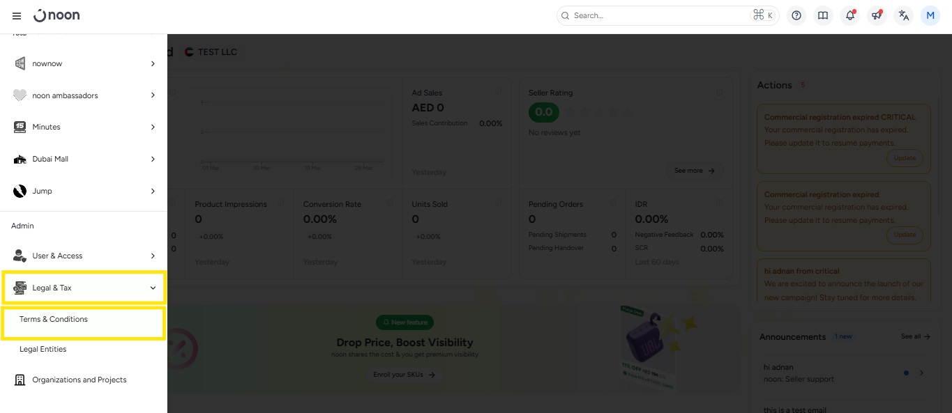 - 在卖家实验室中,点击“法律和税务”选项,然后点击“条款和条件”。
