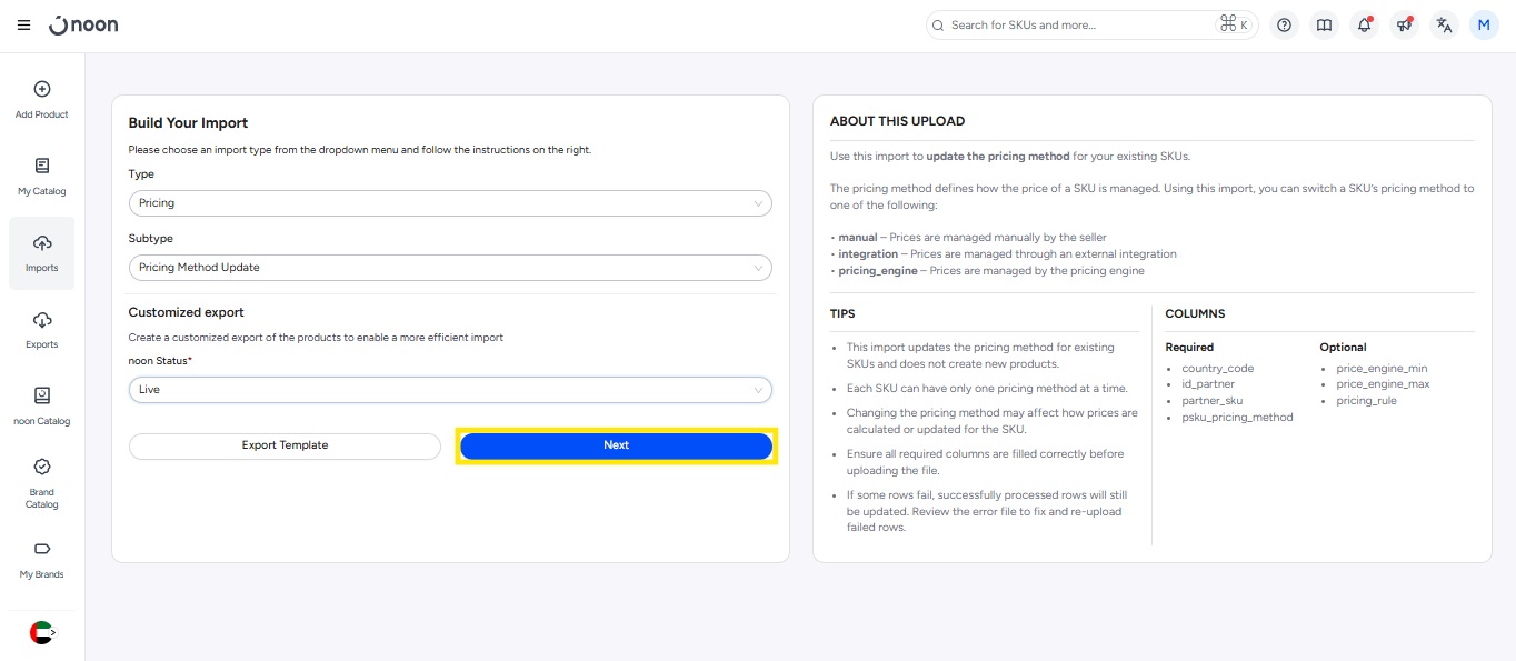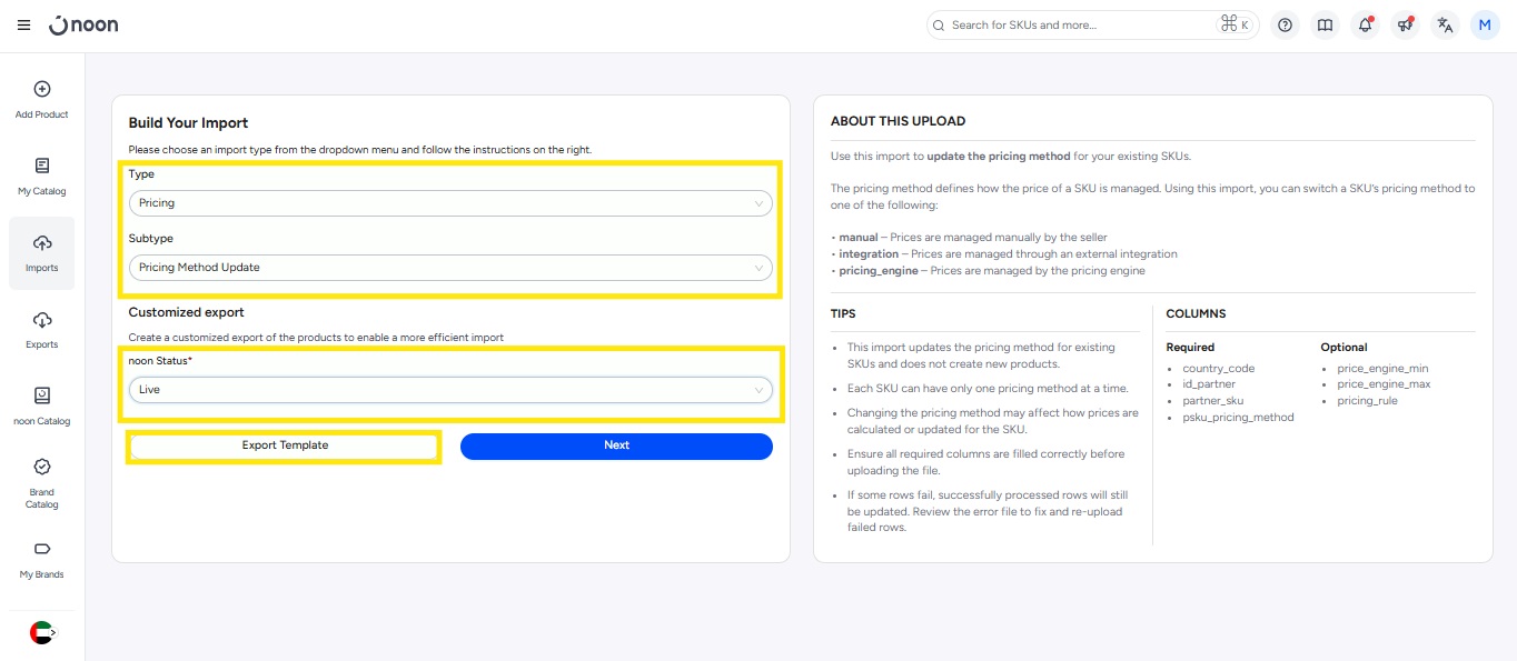- 在“导出类型”中选择“价格”,在“导出子类型”中选择“定价方式更新”,并选择您所需的产品状态。然后点击“导出模板”。