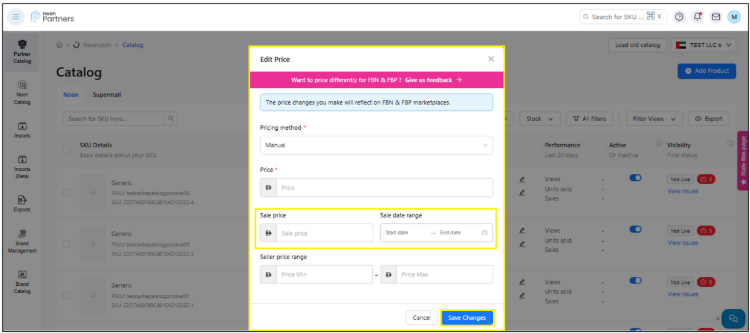 - 更新促销价格并选择促销持续时间,然后点击“保存更改”提交更改,更改将立即反映在 Noon 网站上。如果新的促销价格没有立即显示,请刷新页面。