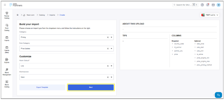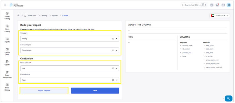 - 选择“价格”作为类别,“价格更新”作为子类别。在“自定义”部分,选择“实时”作为中午状态,“市场”作为中午。然后点击“导出模板”。
