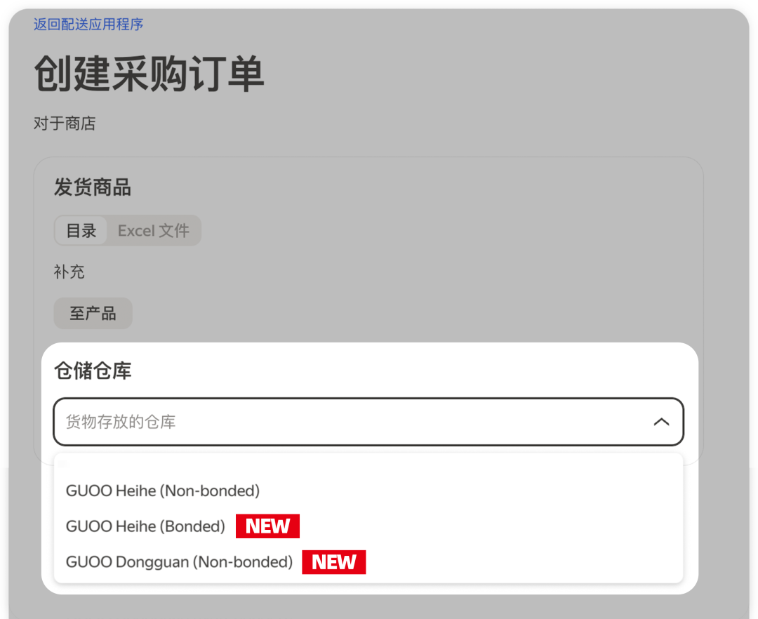选择供货日期,并指定GUOO物流,确保仓库能按时接收商品。