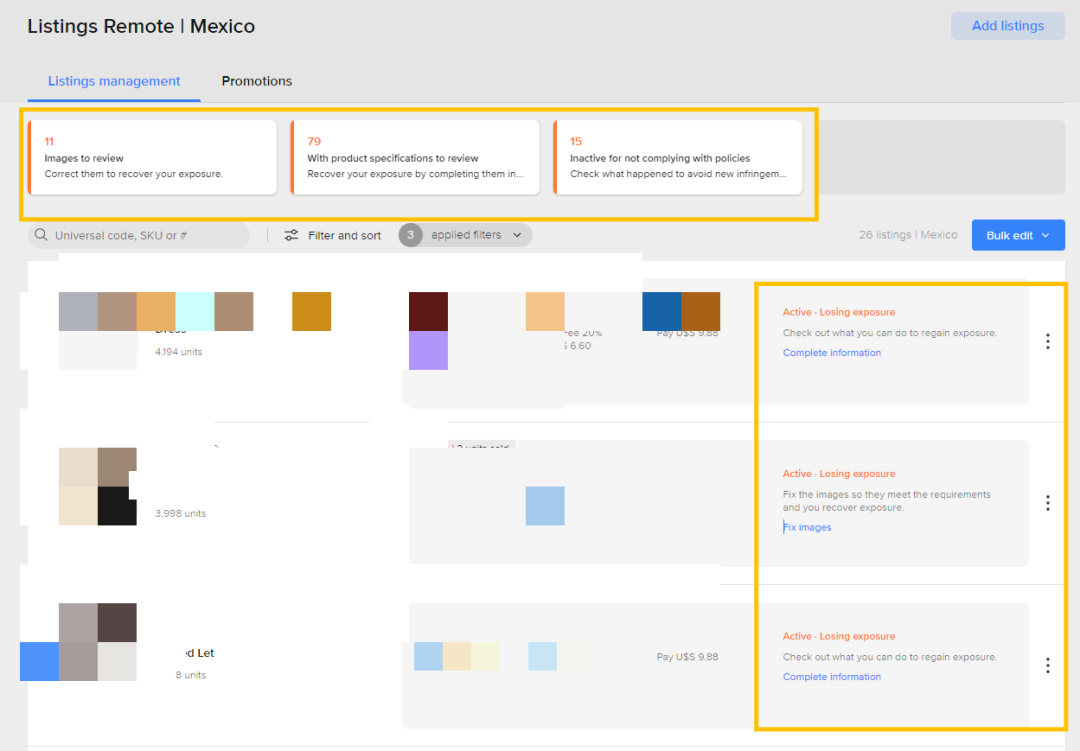 根据listing的活跃状态和需要修复的问题进行分类筛选后,请按照每条listing右侧的提示,修复并重新激活您的listing。