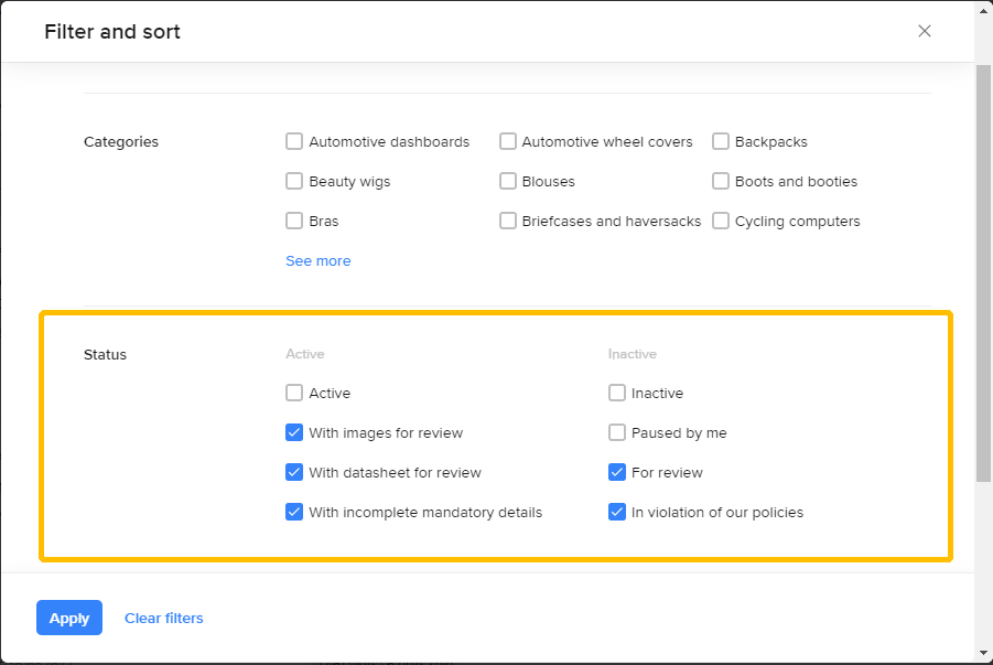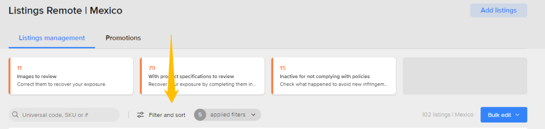 登录卖家后台,点击【Summary】【Listings】【Filter and sort】即可查看不同状态下的listing。