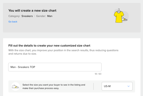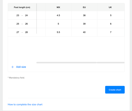 4■ 自定义该尺码表名称,方便后续查找,选定尺码标准(US\UK\EU\Brand)并填写尺码信息,点击【Create chart】
