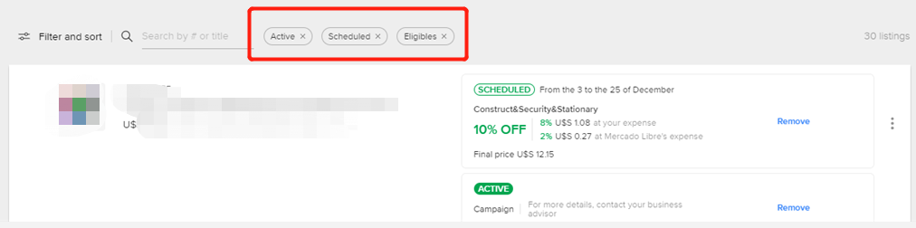 卡片下方的版块会出现所有可提报(Eligibles)、进行中(Active)、已排期(Scheduled)的listing,并且展示促销的名称、排期、折扣以及最终售价,您可以选择提报(Apply),编辑(Edit)也可以移除(Remove)可提报、已排期或进行中的促销活动。