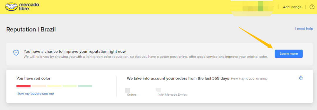 2.点击【Reputation】> 若您的店铺信誉等级非绿色,将会看到提醒您改善信誉等级的提示,点击【Learn more】;
