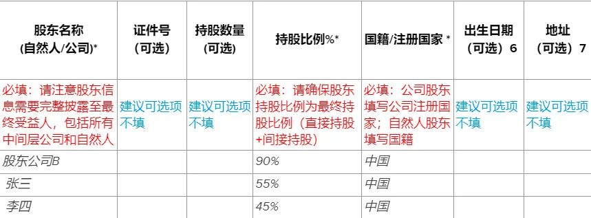 多股东公司需填写公司所有持股股东全名,股东包括公司和自然人;持股比例需要包括直接持股比例加间接持股比例。