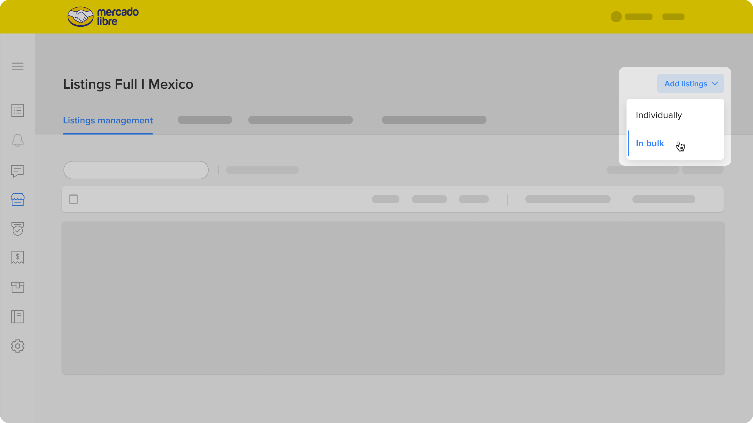 首先,请进入 Mercado Libre 账户中的“商品列表菜单”。点击“列表” ,然后选择“批量”选项。
