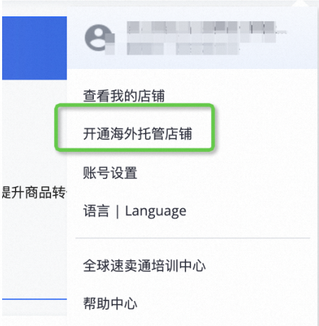 2、通过右上角账号下拉列表,选择「开通海外托管店铺」,进入海外托管开店流程若没有此按钮,请优先联系您的行业小二。