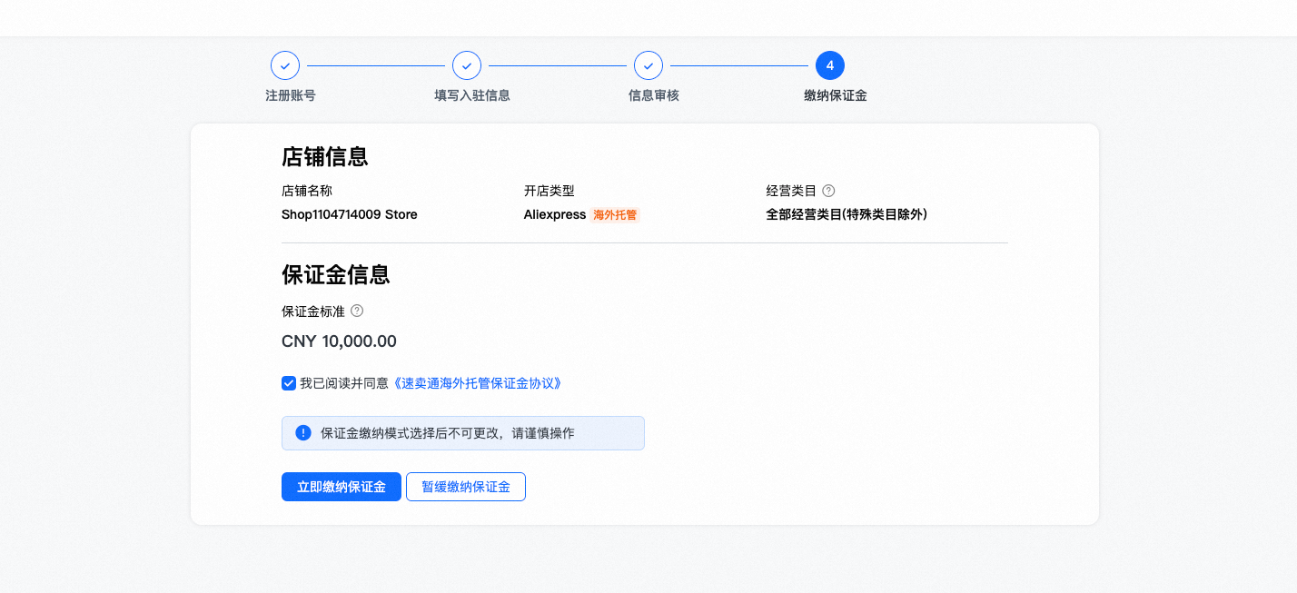 ○若商家选择【暂缓缴纳保证金】,则当商家入驻成功且海外托管店铺有结算货款后,平台将持续冻结店铺的待结算货款中的金额作为保证金,直至冻结金额达到人民币10,000元(或对应结算币种等值金额)。当保证金足额冻结完成后,店铺后续的货款回款才可以正常提现。若商家前期已经绑定了保证金缴纳支付宝,则无法选择暂缓缴纳。