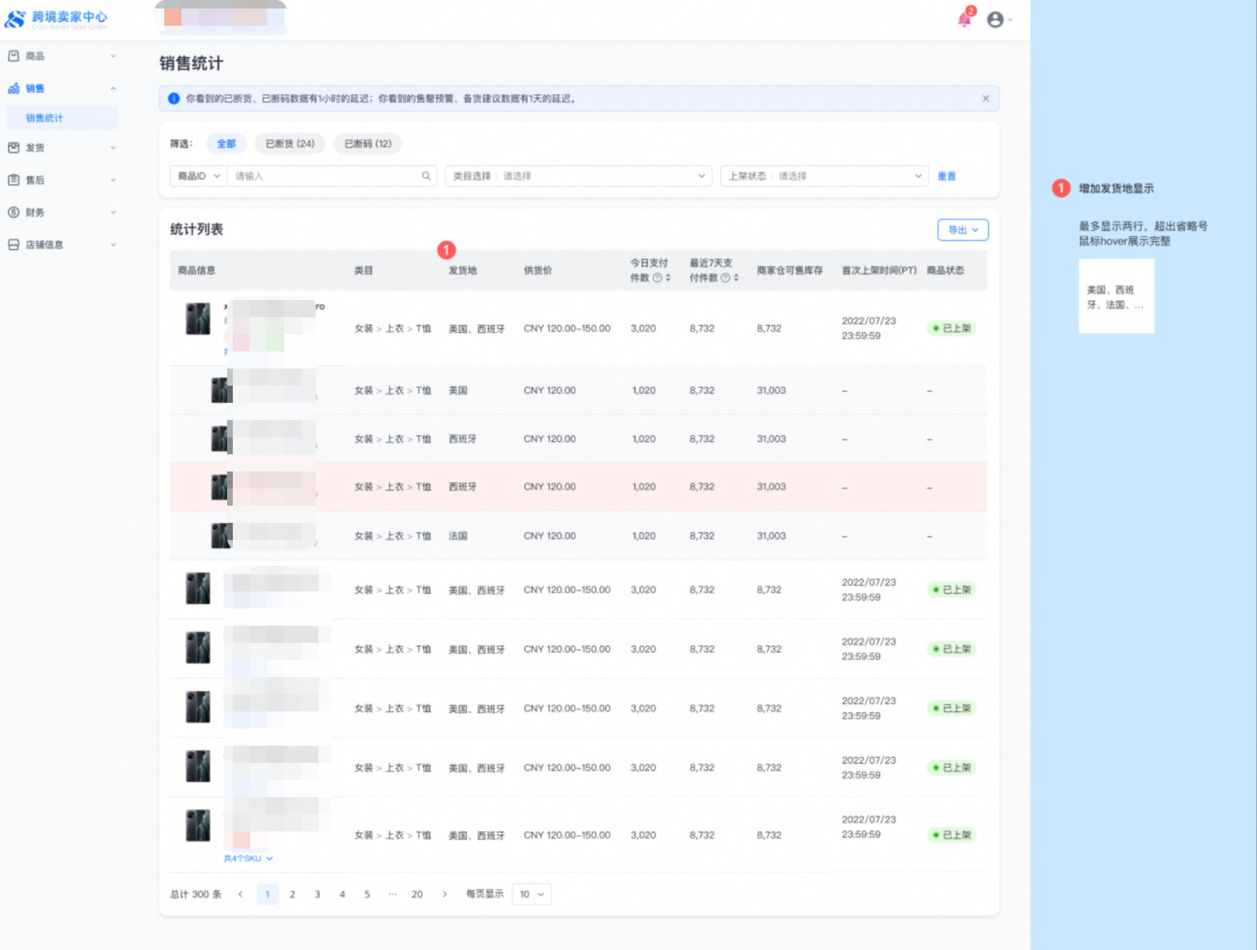 2、统计列表: 以商品维度展示,每个sku的 “销售情况” 和 “库存情况” 库存情况注释:商家仓可售库存