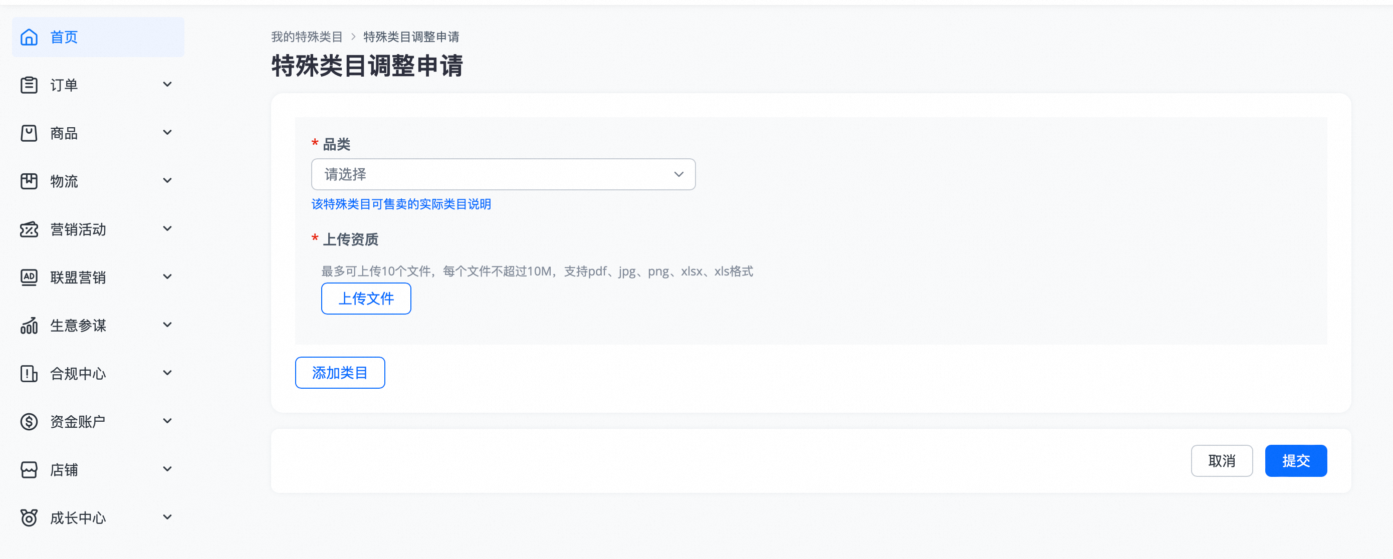 如果商家发品的时候选不到某个类目,比如保健品,可以在特殊类目申请页面找一下提交类目申请