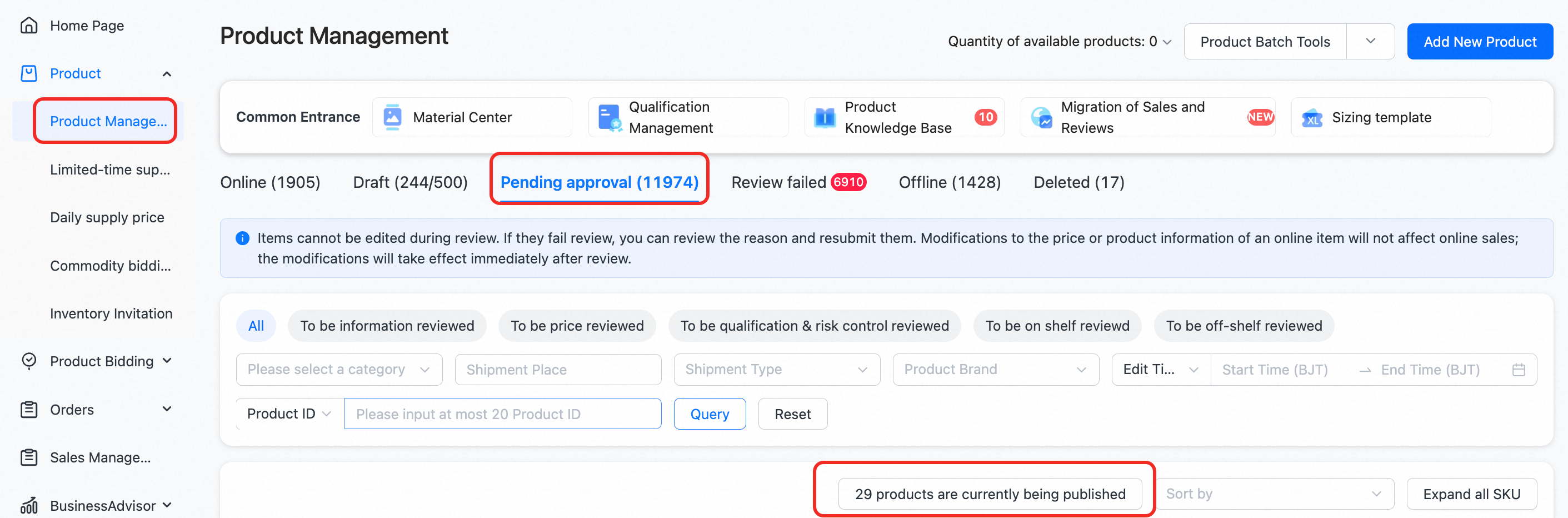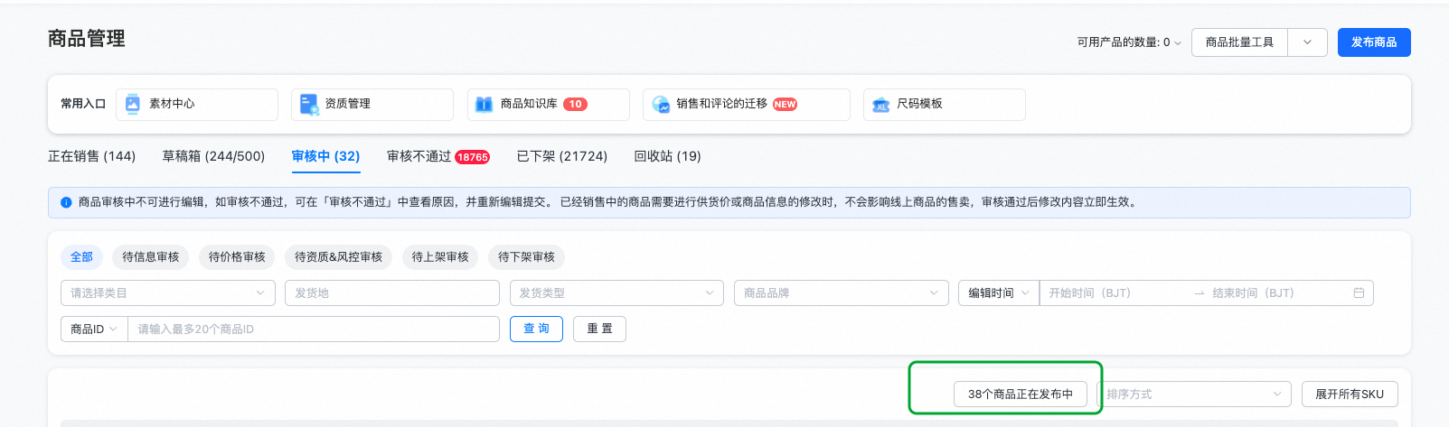 ●其余商品将显示“发布中”状态,并按顺序依次发布。商家可在【商品管理 - 审核中】标签页下查看这些商品。