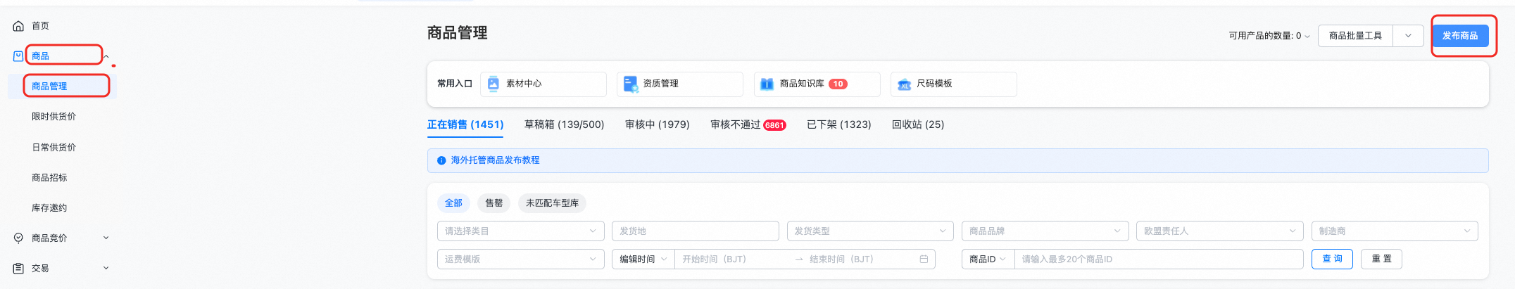 5)商品全部信息填写完成后,点击发布商品,等待审核