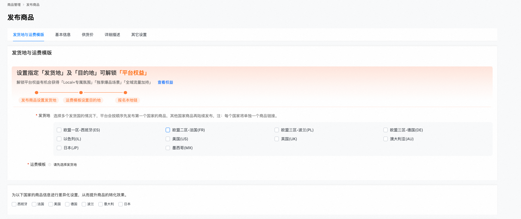 ●一个商品仅支持选择一个发货地,如商家备货多发货地,需要创建不同商品链接(商家可以选择先发布一个后通过复制功能实现快速发品)