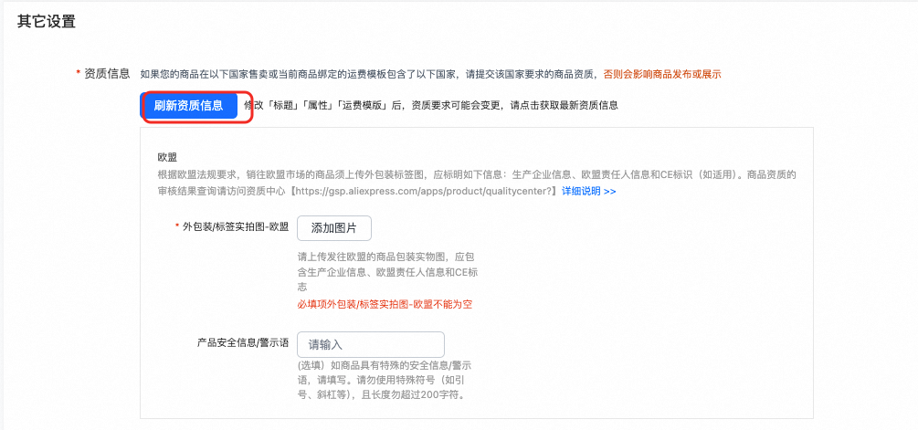 当你设置好了商品的标题、属性和运费模板以后,请点击【资质信息】-【刷新资质信息】来确认您的商品最终需要提交哪些资质,如您的商品只销售到美国,但是系统提示需要上传欧盟相关资质,请检查您的运费模板是否包含了欧盟国家,如您更新了运费模板或商品的其他信息后,需要再次点击【刷新资质信息】获取最新的资质要求。