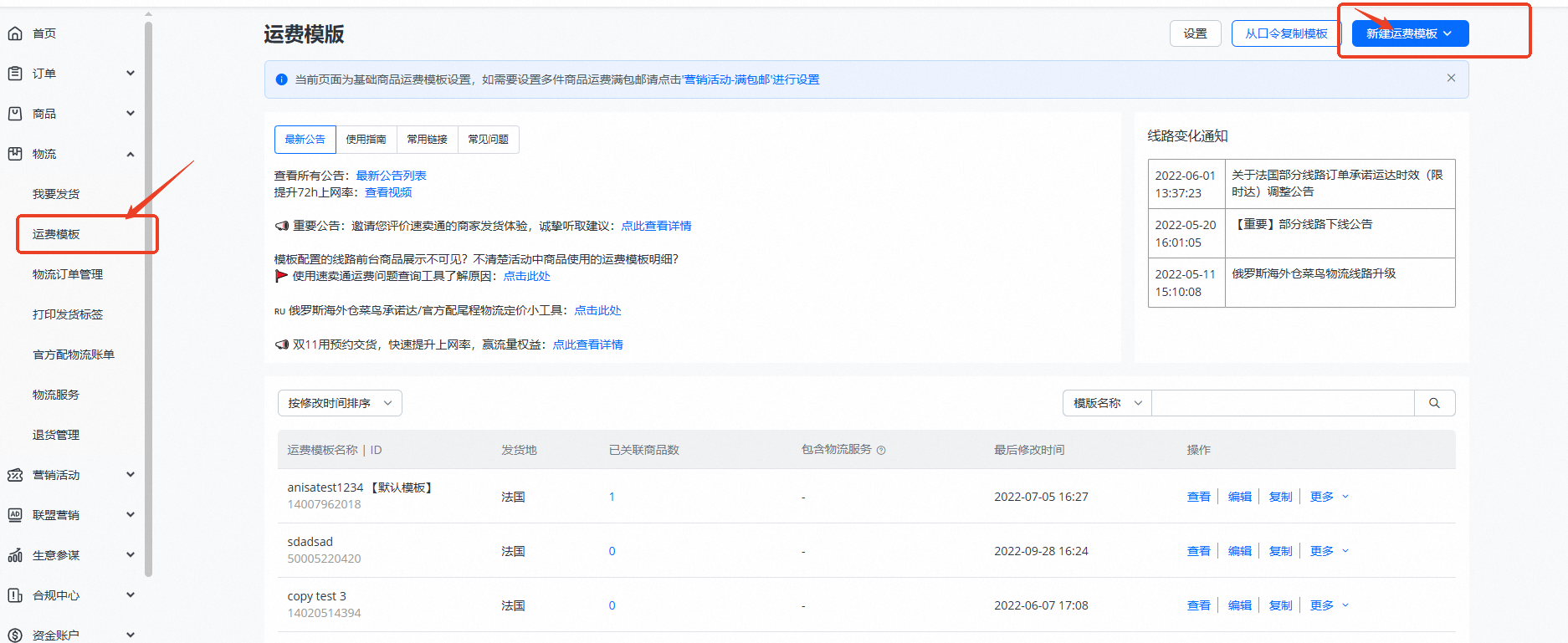 Step 1: 进入运费模板页面,点击右上角【新建运费模板】