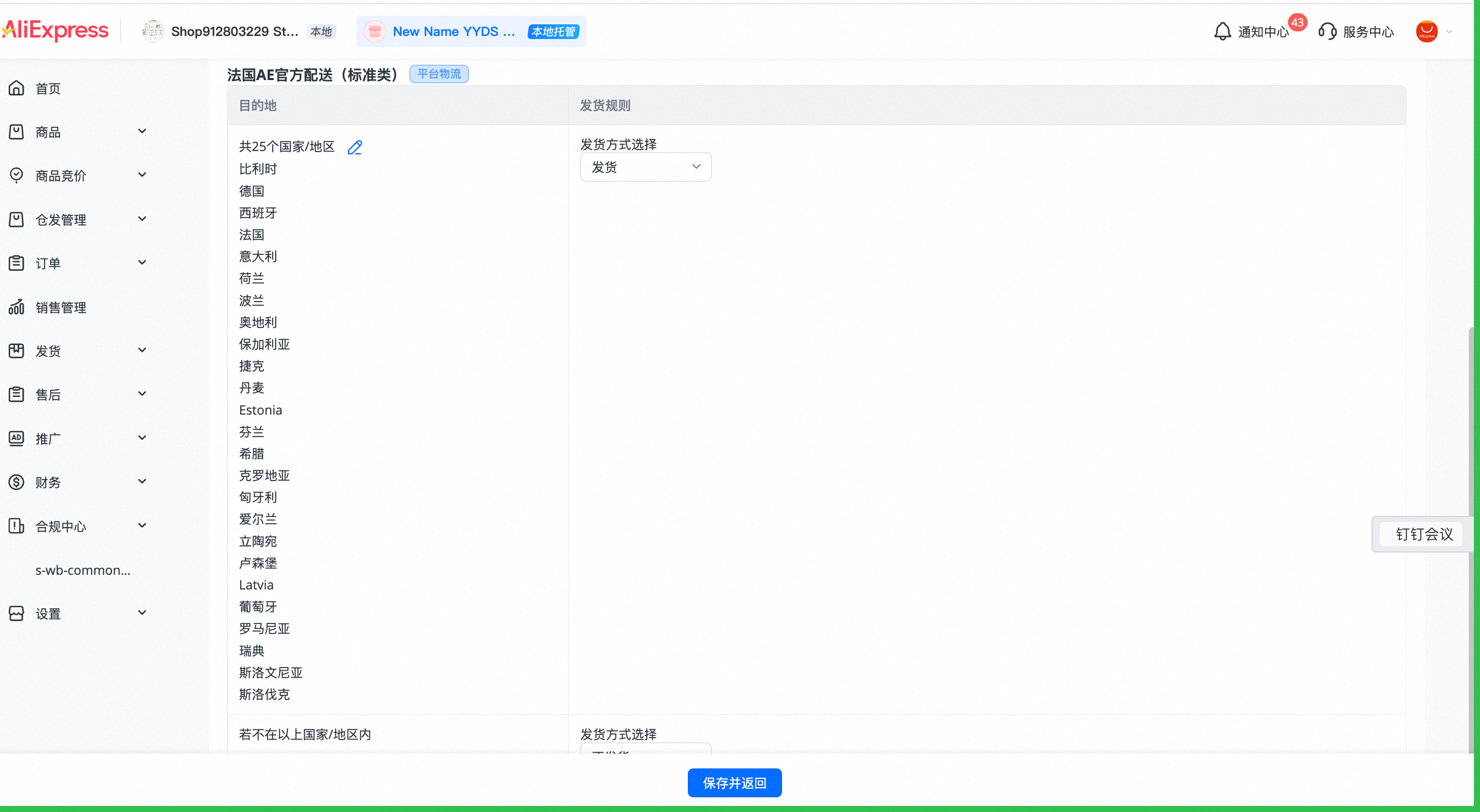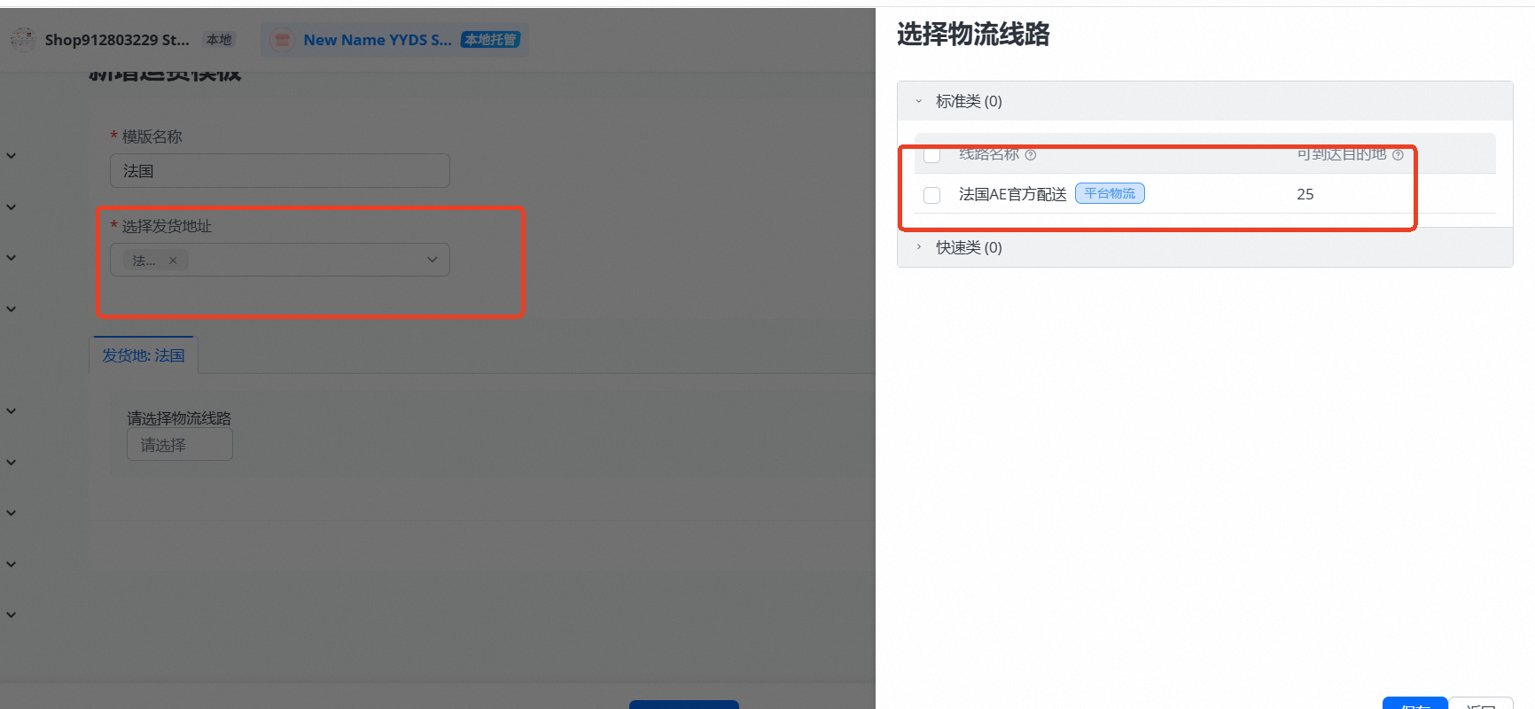 Step 2: 填写模版名称并选择发货地址:例如法国,您可以在同一个运费模板下选择多条物流线路,我们更推荐您使用平台物流服务:x国AE官方配送,选择后点击【保存】