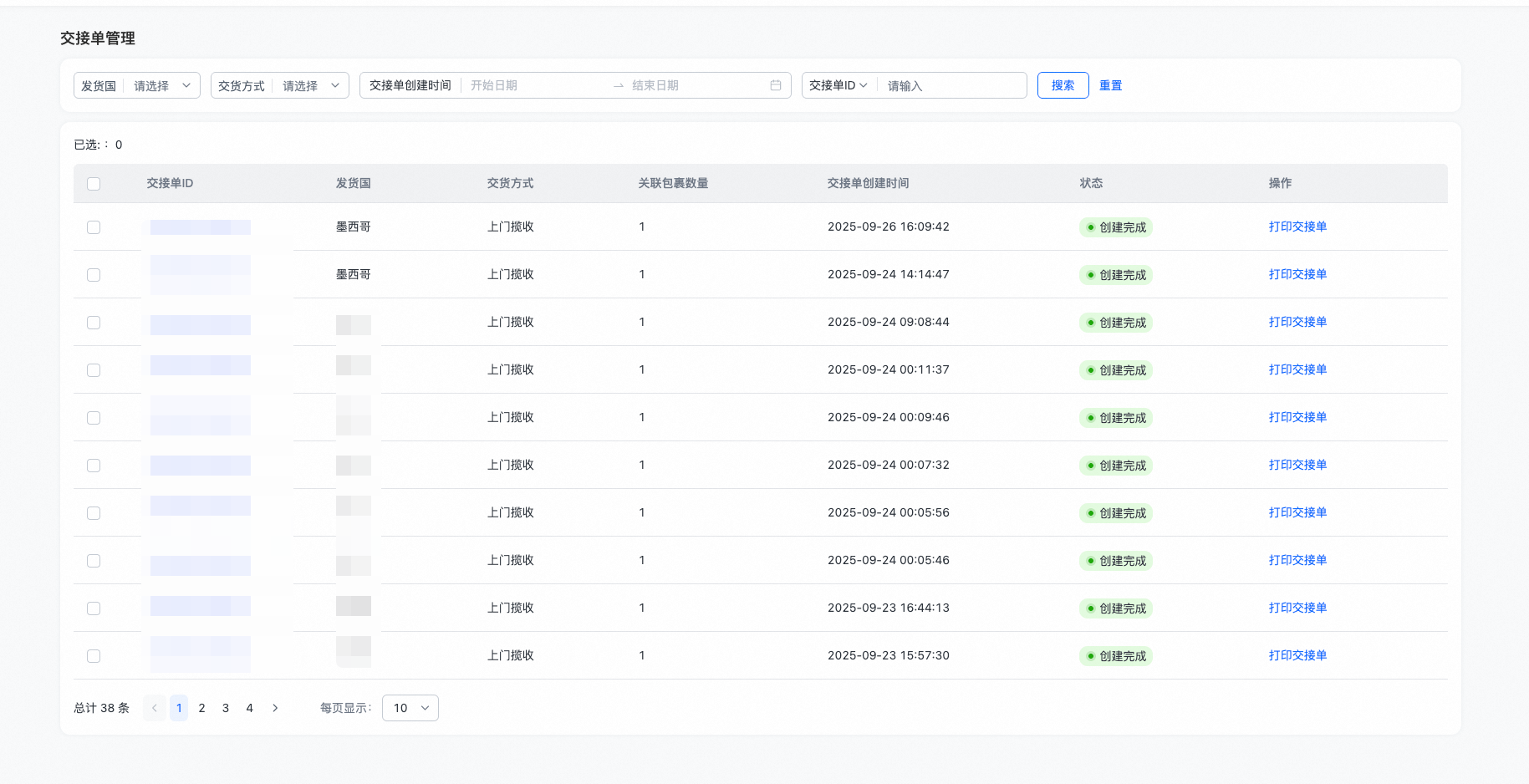 进入【我要发货】页面,点击右上角【交接单管理】即可查看交接单信息,可以选择需要的交接单进行打印。