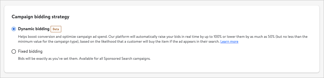 动态竞价(DynamicBidding):这是一种智能竞价策略,致力于帮助卖家节省时间和精力,最大限度地提高转化率并优化广告支出。借助动态竞价,沃尔玛广告会根据广告出现在搜索结果中,客户购买商品的可能性实时提高或降低每次点击成本竞价,竞价会在您设置的基础竞价上下调整,范围为-50%到100%。例如,您的起始竞价为$1.那么您的竞价范围会调整为0.5美金至2美金。我们建议您在积累了一定广告表现后可以尝试开启动态竞价。