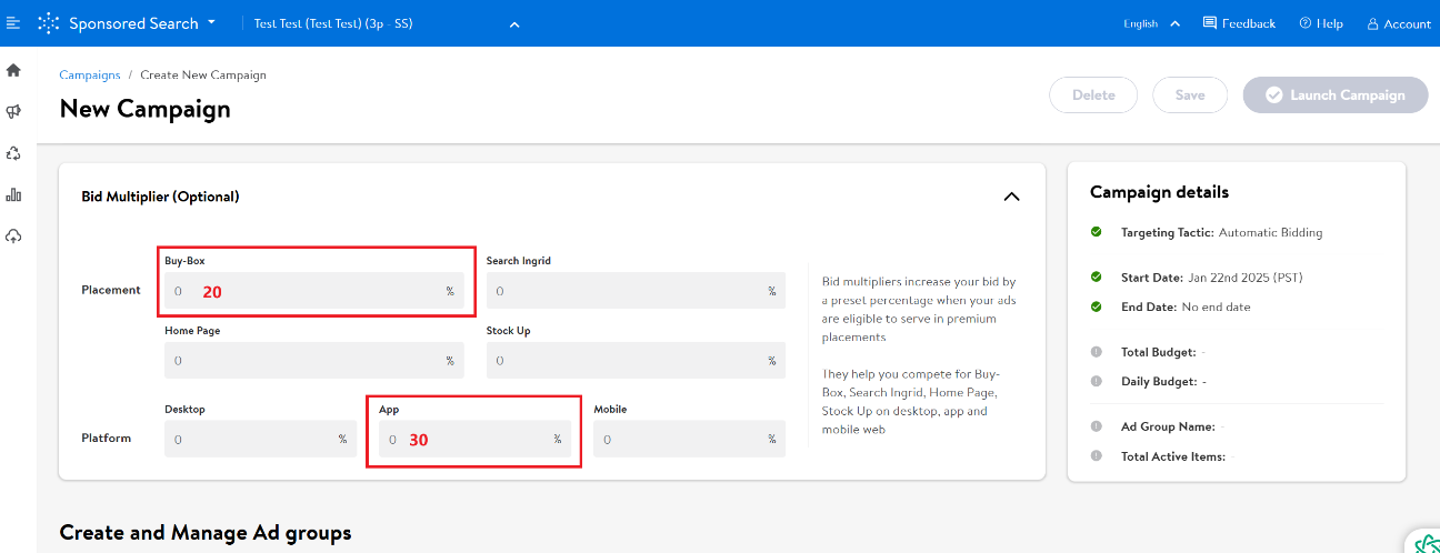 竞价倍增器(Bid Multiplier):输入所有必要信息后,根据自定义报告(Custom report)中的数据选择合适的广告位(Placement)/广告设备(Platform)添加竞价乘数我们提供在指定广告位/广告设备提高出价的功能,例如,您起始竞价为1美金,您在购物车广告位(Buybox)填入20%,在App端填30%,那么您最终的竞价计算公式:1+[1*(20%+30%)]=1.5美金。
