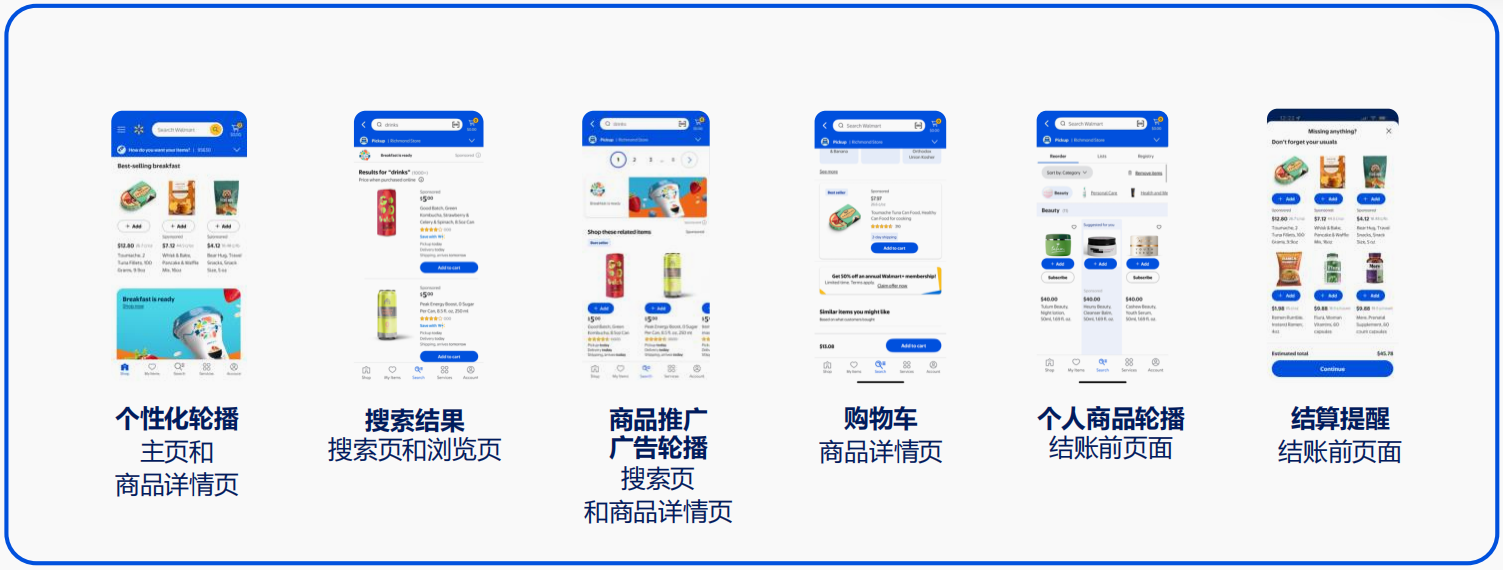 商品推广广告出现在主页、浏览页、搜索页商品页等突出且高流量的位置。可以推动沃尔玛客户发现并购买更多商品;提升商品曝光度,最大限度提高转化量与销量。