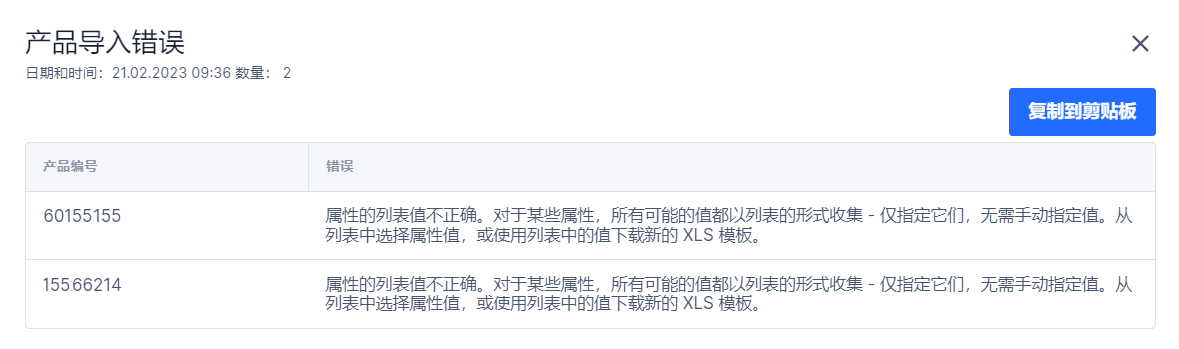系统会检查您所注明信息的正确性。检查结果将显示在商品 → 更新记录文档检查状态以及信息有误的商品总数会在表中显示。以得知具体问题所在,请在操作栏中单击并选择了解有关错误的更多信息。