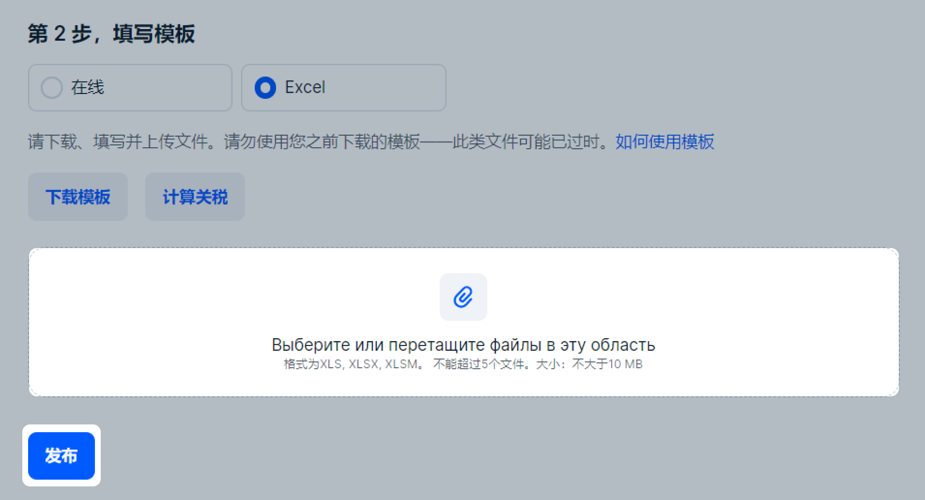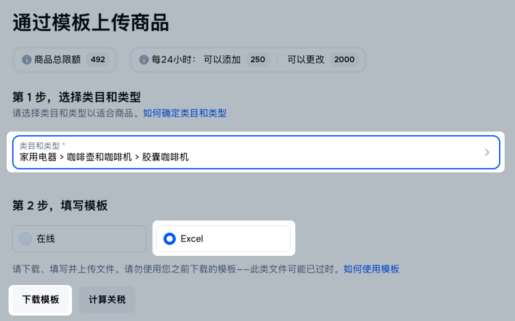 2.请选择类目并下载Excel模板。当商品同时归属于若干类别时,请选择一个优先的商品类别。
