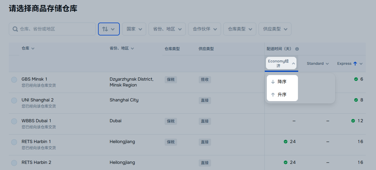如需按配送时效对表格进行排序,请点击速度名称,并选择降序或升序。相关指标每周更新一次。