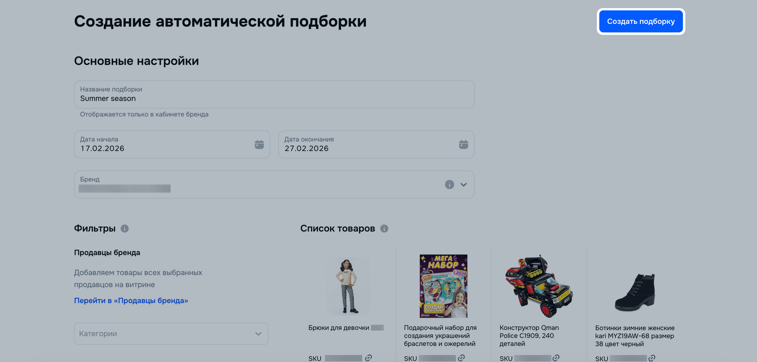 选择要创建精选商品集的品牌。该品牌在橱窗中必须至少有1位已选卖家。如果选择多个品牌,则无法将该精选商品集添加到橱窗。