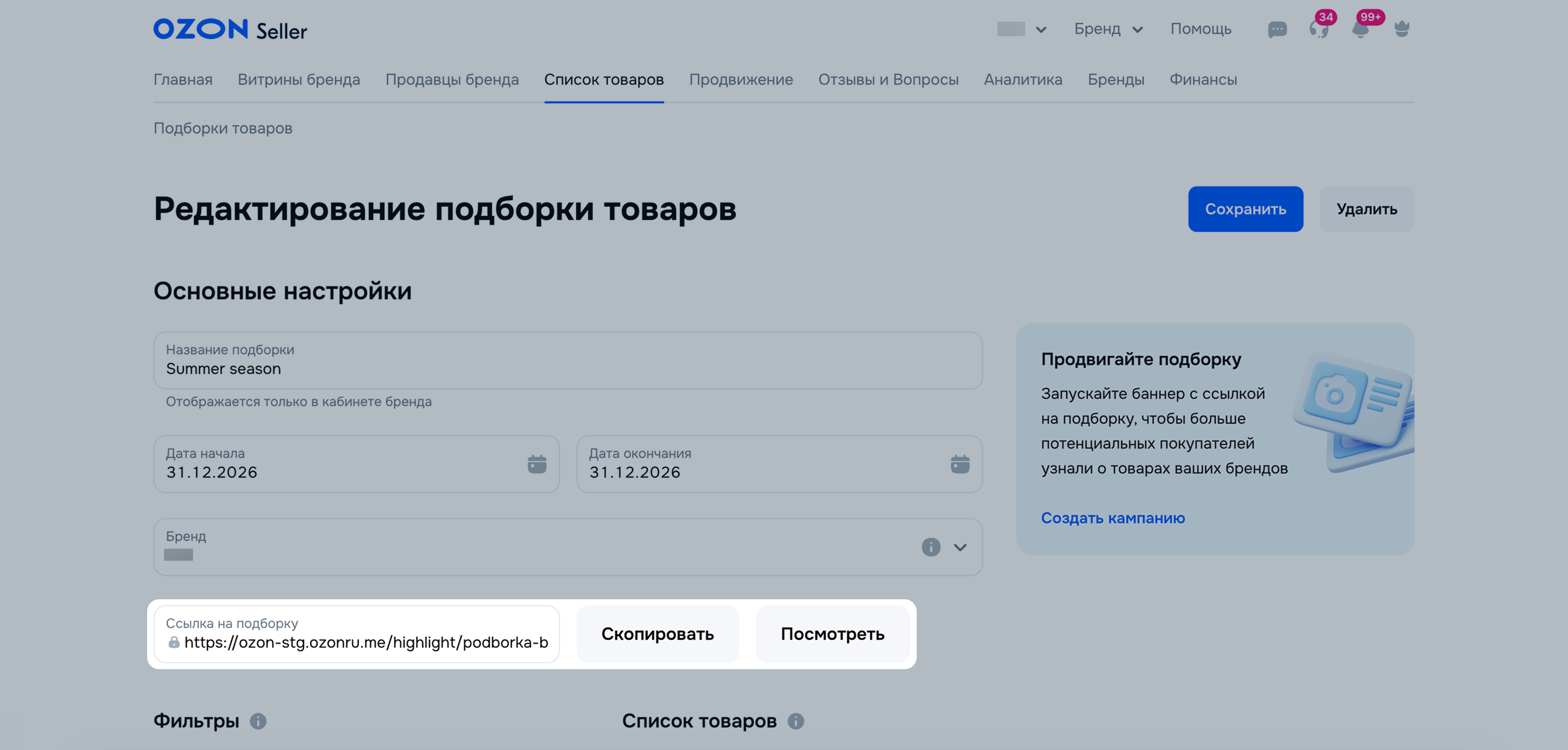 在精选商品集页面的基本设置区块中,会显示所选商品页面的链接。您可以复制该链接,并在需要的买家沟通渠道中使用。