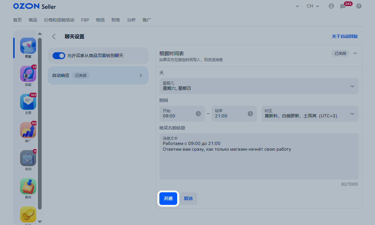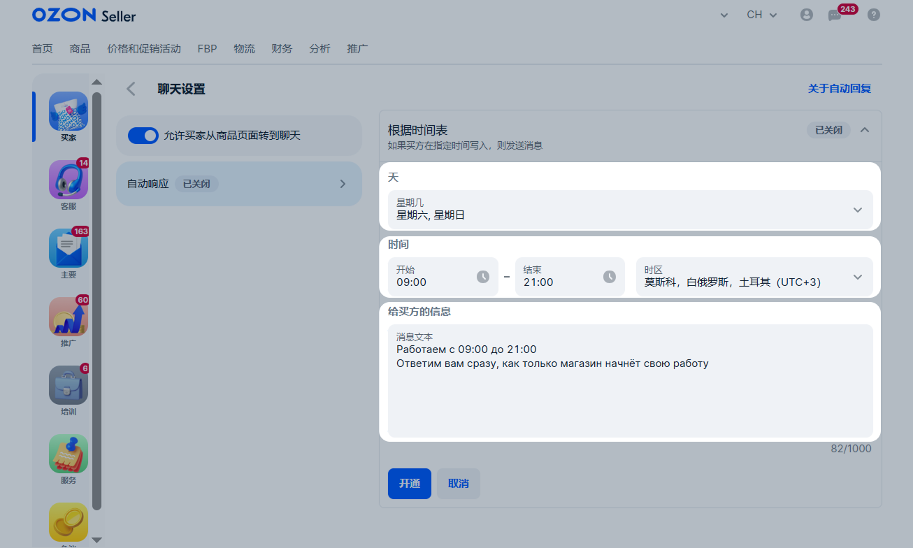 选择发送自动回复的星期几和时间。如果您未填写星期几,则默认为星期六和星期日;如果您未填写时间,则默认为 8:00 至 20:00。