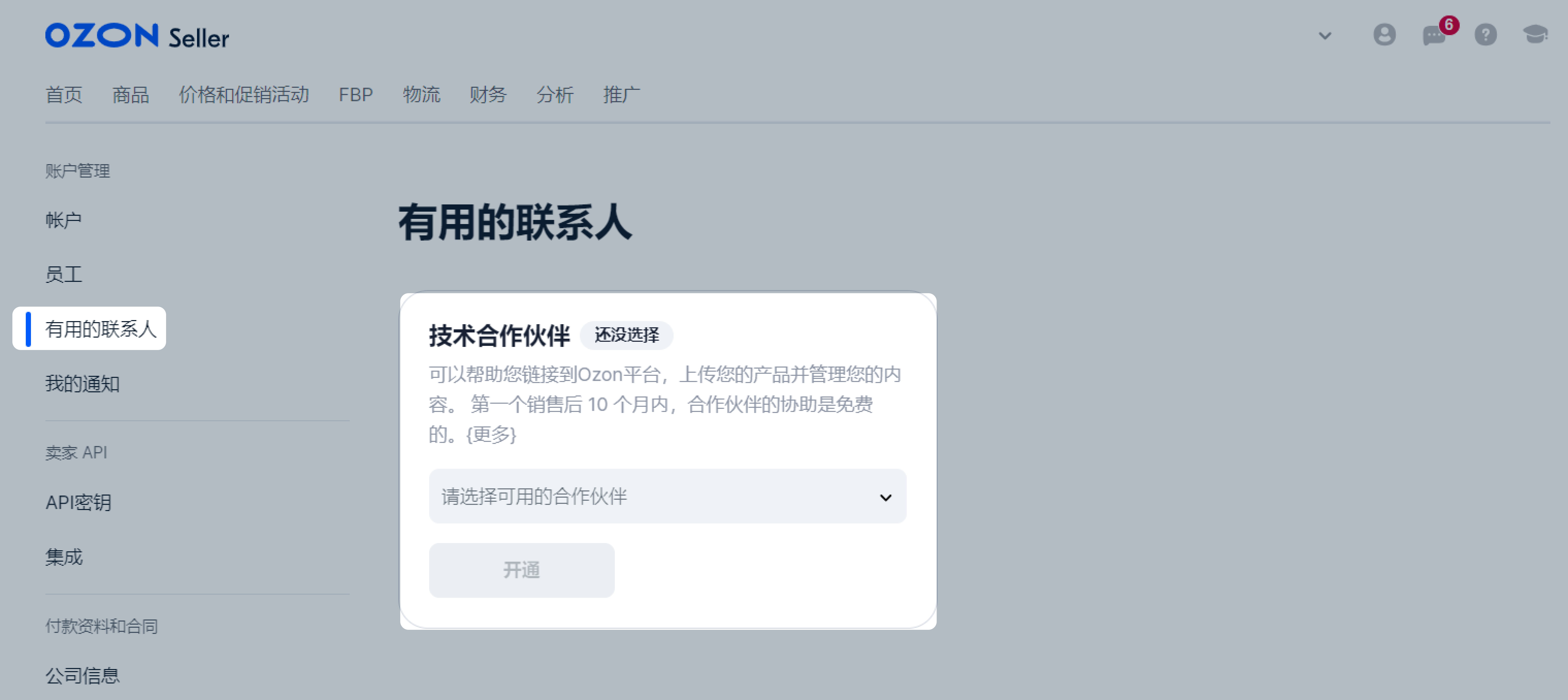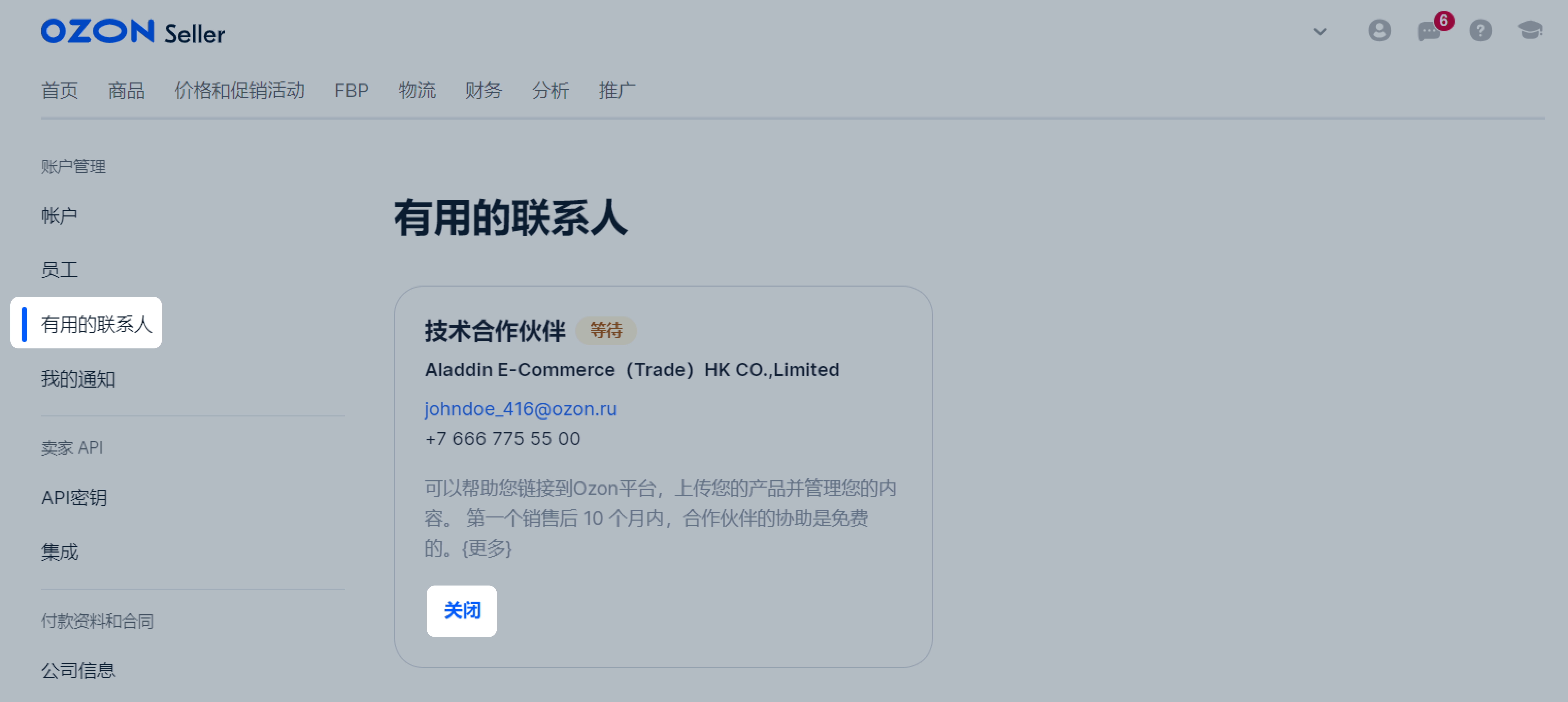 当合作伙伴确认绑定时,他的公司将出现在个人账户中的设置 → 账户管理 → 有用的联系人部分。